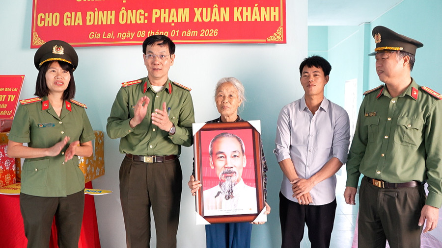 Công an tỉnh trao ảnh Bác Hồ cho gia đình ông Phạm Xuân Khánh. Ảnh Bảo Long
