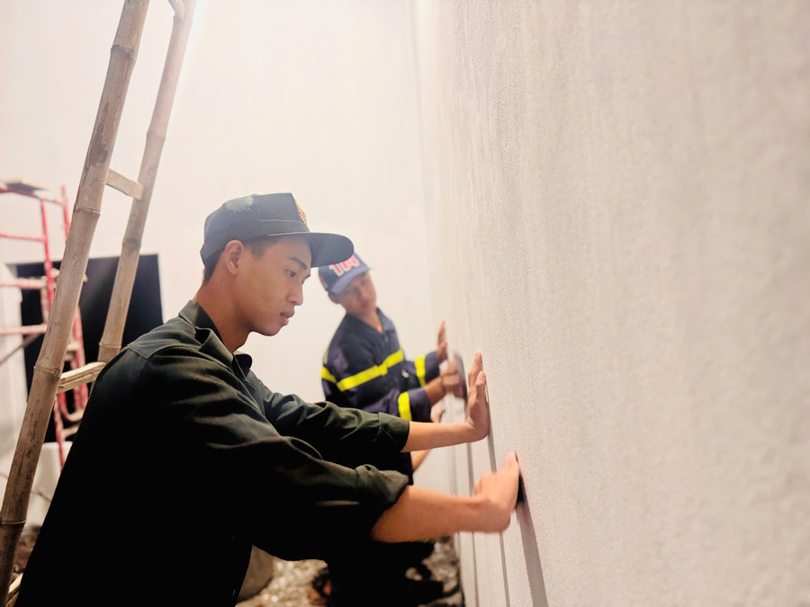 Cán bộ, chiến sĩ làm việc xuyên Tết Dương lịch tại công trình nhà ông Nguyễn Bá Hồng để đảm bảo kịp tiến độ. Ảnh: Quý Hiền