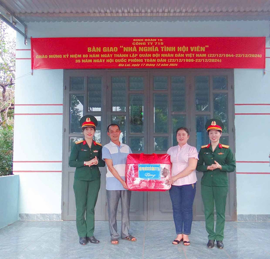 Hội Phụ nữ Đoàn Kinh tế - Quốc phòng 715 (Binh đoàn 15) tặng nhà “Nghĩa tình hội viên” cho gia đình chị Phạm Thị Thu, ở làng Mít Jép, xã Ia O. Ảnh: Thanh Quý