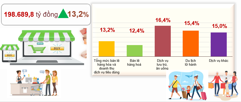 Khu vực dịch vụ Quý IV/2025 tăng 7,07% so với cùng kỳ. Trong đó, ngành bán buôn, bán lẻ tăng 7,17% so với cùng kỳ năm trước (đóng góp 0,53 điểm phần trăm); ngành vận tải, kho bãi tăng 13,74% (đóng góp 0,51 điểm phần trăm); dịch vụ lưu trú và ăn uống giảm 1,2% (giảm 0,04 điểm phần trăm); hoạt động hành chính và dịch vụ hỗ trợ tăng 6,07% (đóng góp 0,04 điểm phần trăm); hoạt động dịch vụ khác tăng 8,48% (đóng góp 0,09 điểm phần trăm).