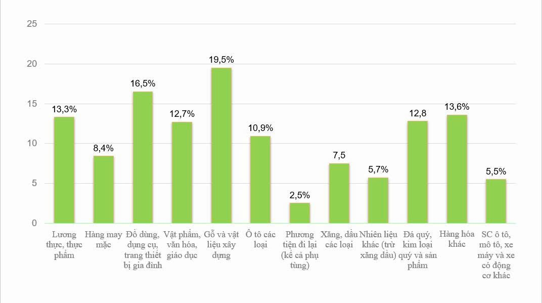 + Nhóm hàng tăng giá: nhóm thuốc và dịch vụ y tế (+20,98%), nhóm nhà ở, điện nước, chất đốt và VLXD (+10,31%), tiếp theo là các nhóm khác tăng lần lượt: nhóm hàng ăn và dịch vụ ăn uống (+4,40%), nhóm hàng hóa và dịch vụ khác (+3,13%), nhóm thiết bị đồ dùng gia đình (+2,73%), nhóm giáo dục (+1,98%), nhóm đồ uống và thuốc lá (+1,70%), nhóm văn hóa, giải trí và du lịch (+1,36%), nhóm may mặc và giày dép (+1,14%).