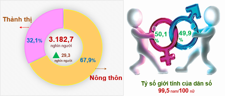 Quy mô dân số thành thị của tỉnh có 1.023 nghìn người, chiếm 32,1%; quy mô dân số nông thôn có 2.159,7 người, chiếm 67,9%.