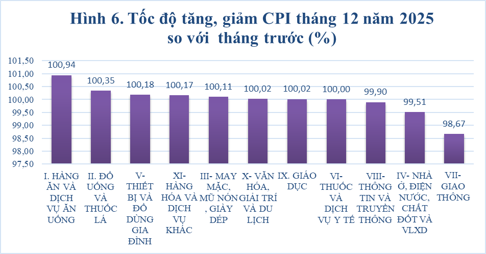 Tháng 12/2025, có 7 nhóm hàng hóa và dịch vụ tiêu dùng tăng giá, 3 nhóm hàng giảm giá và 01 nhóm hàng bình ổn giá so với tháng trước. Mức tăng, giảm cụ thể như sau: