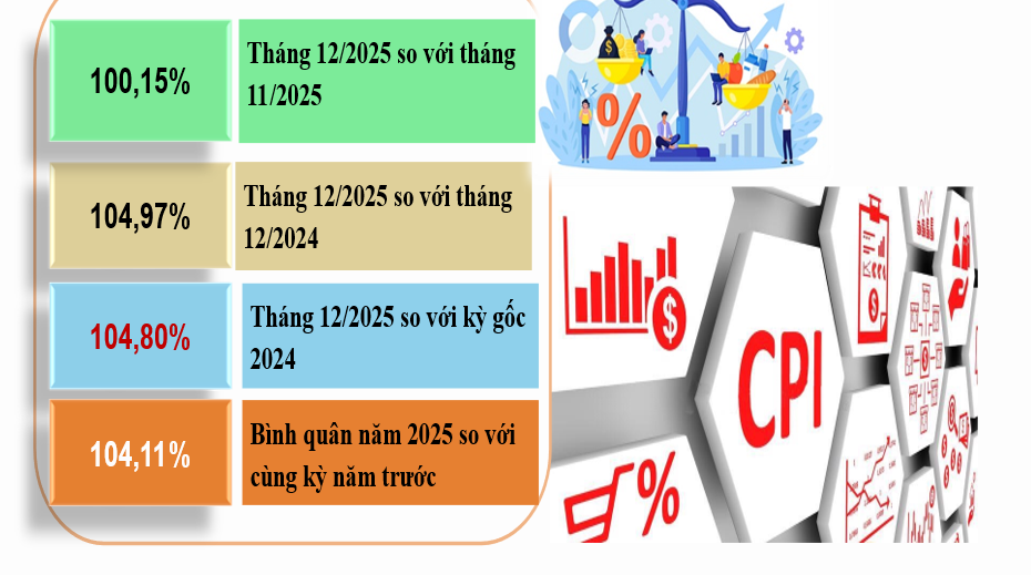 Chỉ số giá tiêu dùng trong tháng 12/2025 tăng 0,15% so với tháng trước; tăng 4,97% so với cùng kỳ năm trước. Bình quân năm 2025 tăng 4,11% so với cùng kỳ năm trước.