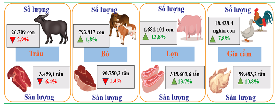 - Chỉ số nhóm sản phẩm từ chăn nuôi tăng 2,7% so cùng kỳ. Trong đó, giá nhóm sản phẩm trâu, bò giảm 1,8% so cùng kỳ, giá lợn tăng 1,2% so cùng kỳ; giá nhóm gia cầm tăng 6,4%.