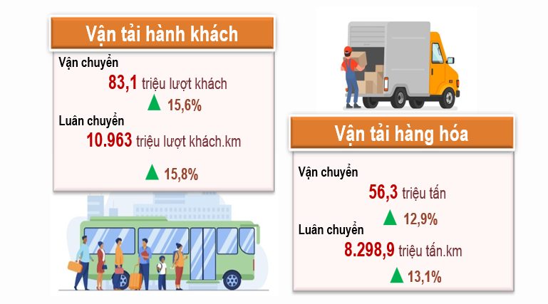 - Doanh thu vận tải hàng hóa tháng 12/2025 ước đạt 865,1 tỷ đồng, tăng 6,2% so với tháng trước và tăng 16,8% so với cùng kỳ năm trước, chiếm tỷ trọng cao nhất 49,4% so với tổng doanh thu vận tải, kho bãi. Năm 2025, doanh thu vận tải hàng hóa dự tính đạt 9.457,8 tỷ đồng, tăng 10,7% so với cùng kỳ và chiếm tỷ trọng cao nhất 48,3%.