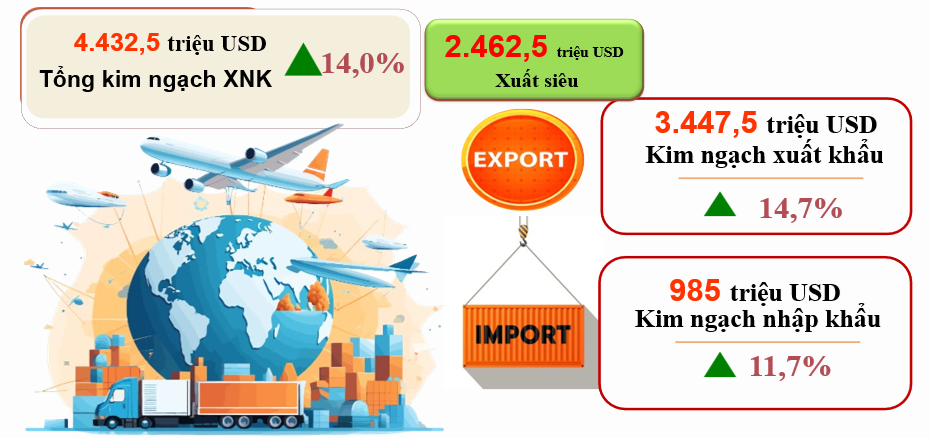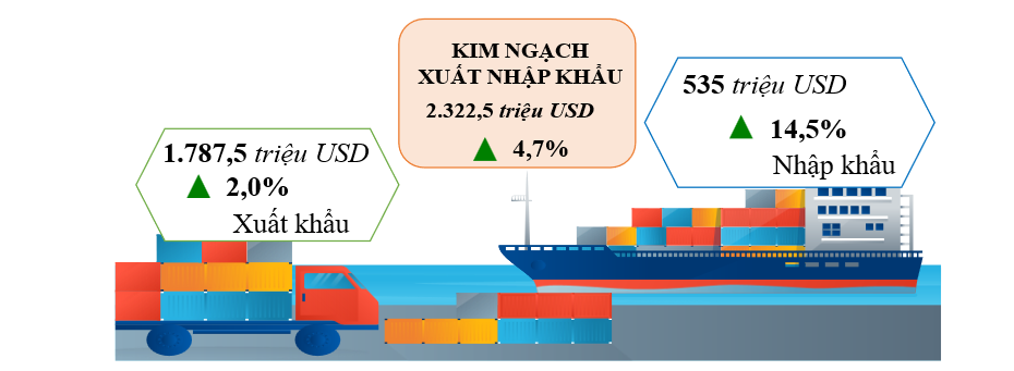 Tổng kim ngạch xuất, nhập khẩu hàng hóa tháng 12/2025 ước đạt 105,6 triệu USD, giảm 5,8% so với tháng trước và giảm 50,9% so với cùng kỳ năm trước. Năm 2025, tổng kim ngạch hàng hóa xuất nhập khẩu ước đạt 2.110 triệu USD, tăng 26,4% so với cùng kỳ, cán cân thương mại hàng hóa tiếp tục xuất siêu ước đạt 1.210 triệu USD.