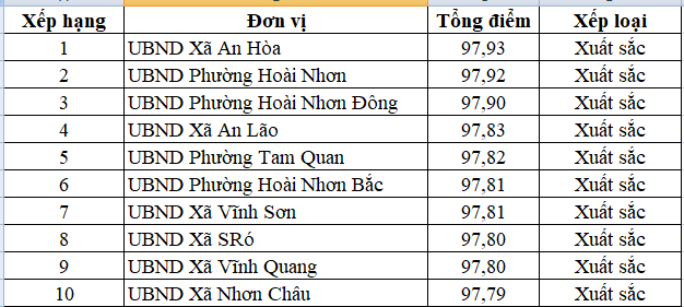 10 đơn vị cấp xã đạt điểm cao nhất: