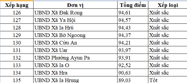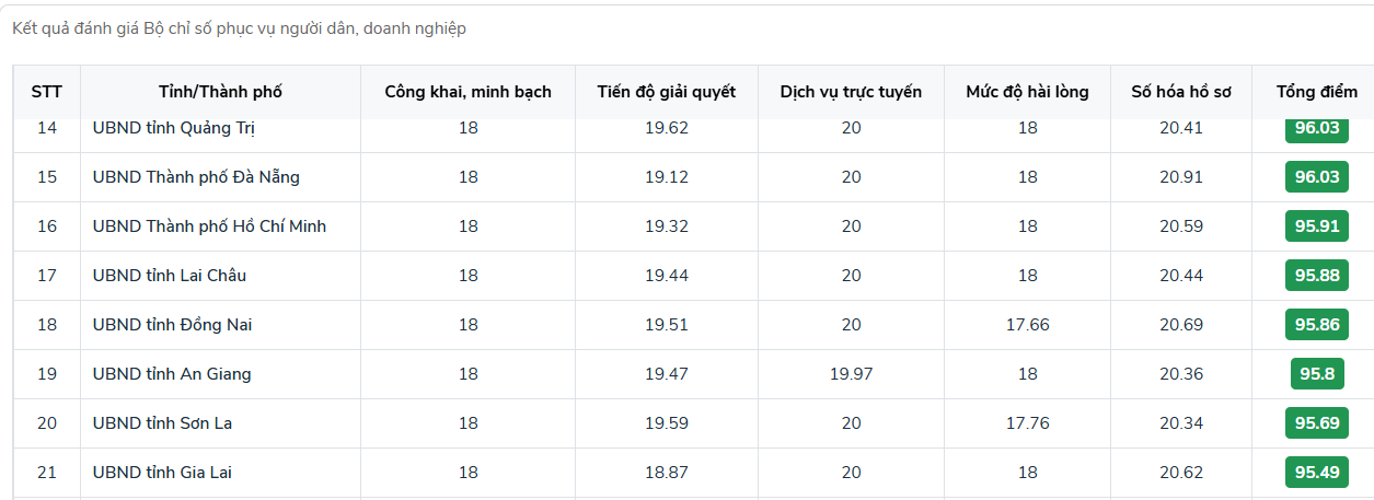 Ở cấp tỉnh, 100% cơ quan xếp loại xuất sắc. Đơn vị có tổng điểm cao nhất là Sở Y tế, đạt 95,81 điểm; tiếp đến là Ban Quản lý Khu kinh tế đạt 95,67 điểm và Sở Khoa học và Công nghệ đạt 95,31 điểm. Ở cấp xã, 134/135 xã, phường xếp loại xuất sắc, cho thấy sự chuyển biến tích cực trong việc phục vụ người dân, doanh nghiệp tại cơ sở.