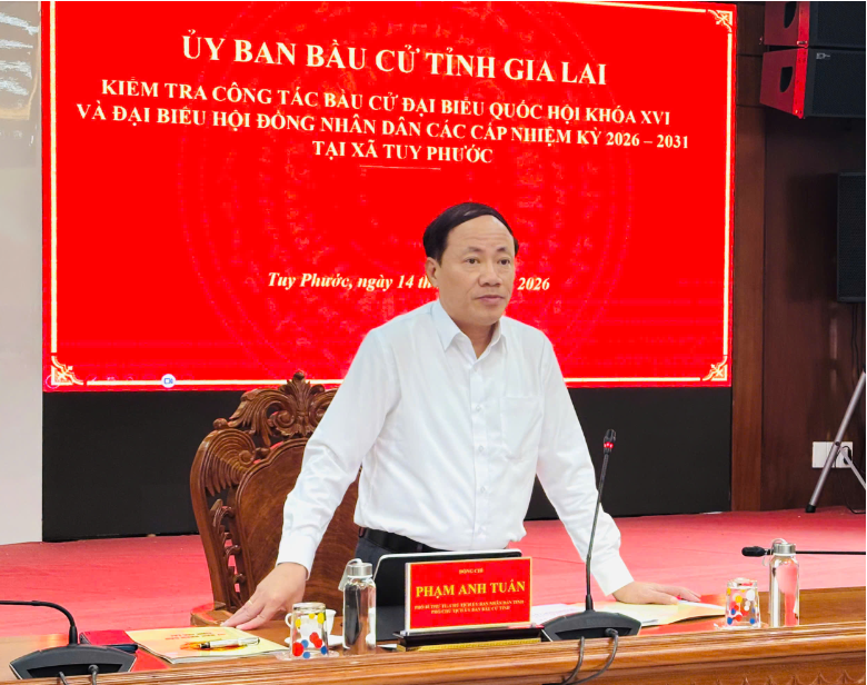 Chiều 14/1, Chủ tịch UBND tỉnh, Phó Chủ tịch Ủy ban bầu cử tỉnh Gia Lai Phạm Anh Tuấn đã kiểm tra công tác chuẩn bị bầu cử đại biểu Quốc hội khóa XVI và đại biểu HĐND các cấp nhiệm kỳ 2026-2031 tại xã Tuy Phước và phường Quy Nhơn Nam. Tại đây, ông Phạm Anh Tuấn yêu cầu các địa phương phải thực chất trong bầu cử với phương châm "không chạy đua thành tích, không cần nhanh nhất, chỉ cần đảm bảo thời gian và chất lượng bầu cử thực chất nhất".