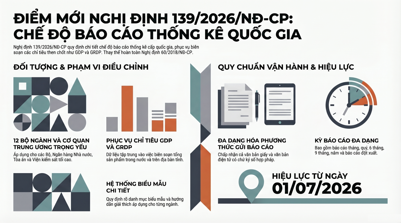 Theo đó, Nghị định số 139/2026/NĐ-CP sẽ chính thức có hiệu lực từ ngày 01/7/2026, thay thế Nghị định số 60/2018/NĐ-CP, với nhiều nội dung đổi mới quan trọng nhằm hoàn thiện chế độ báo cáo thống kê quốc gia.