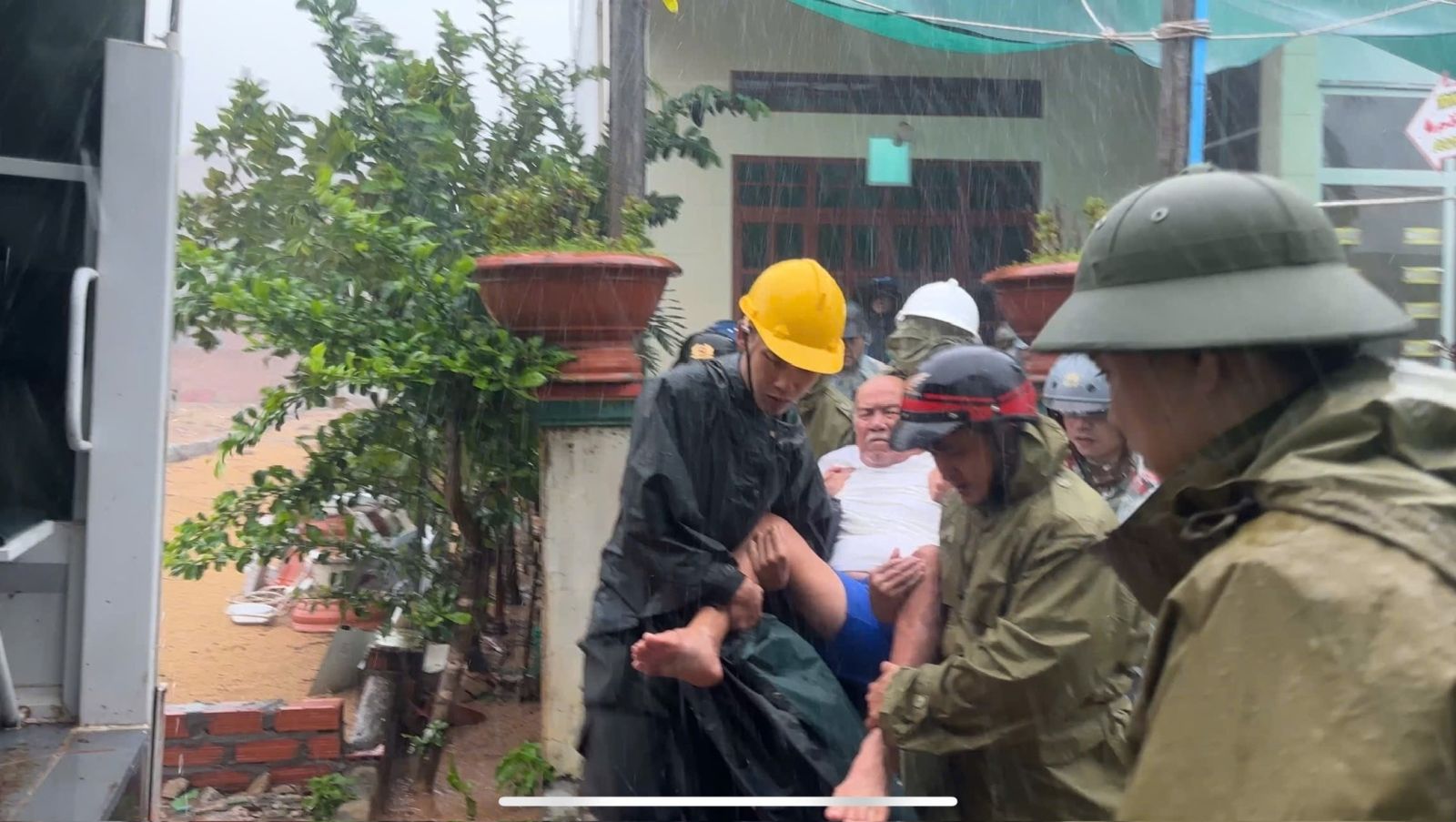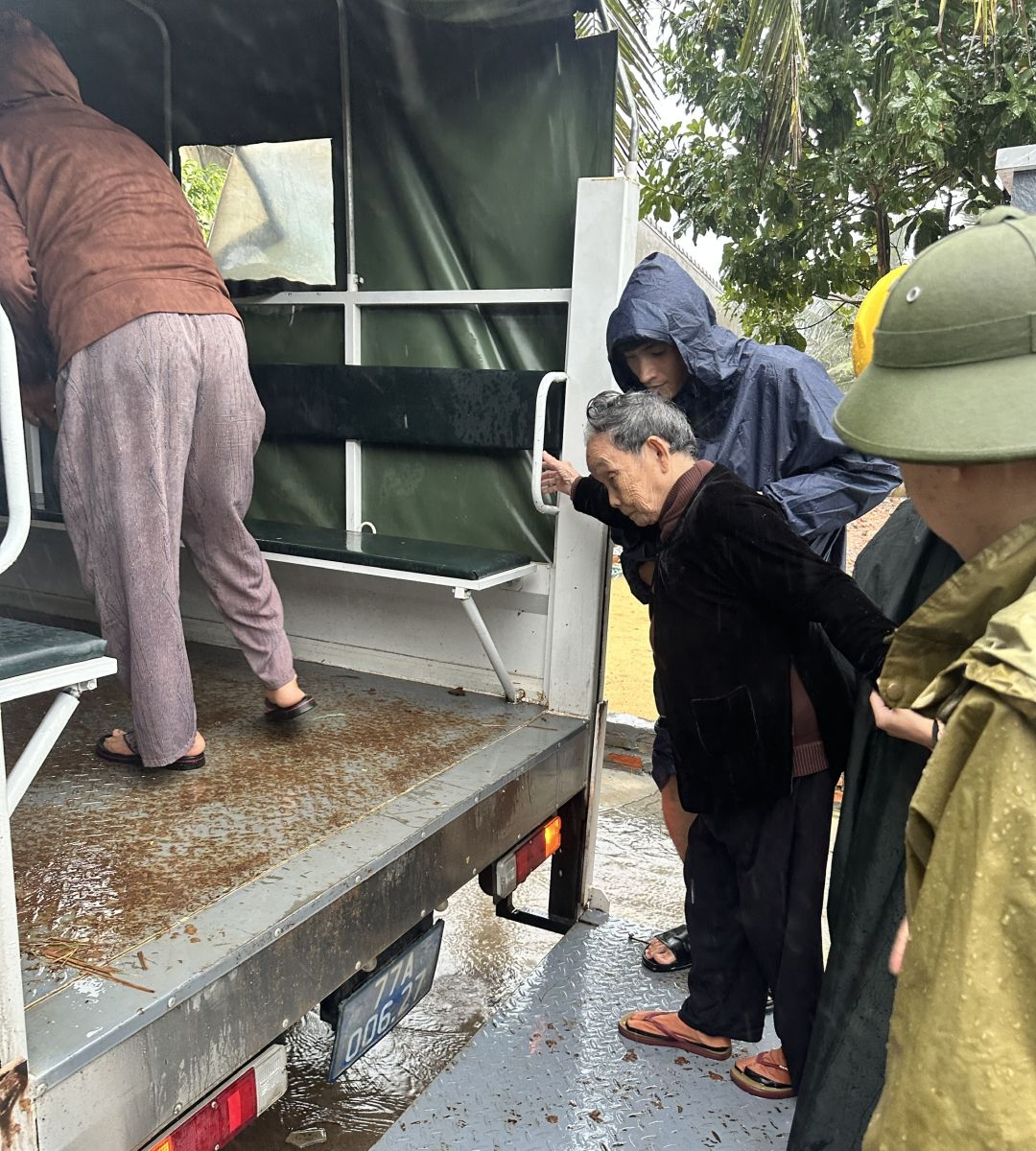 Cán bộ, chiến sĩ Phòng PC06 hỗ trợ người dân di dời đến nơi an toàn để phòng, tránh bão số 13 (Kalmaegi).