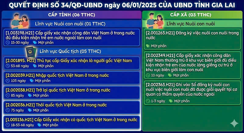 (1) Cấp giấy xác nhận công dân Việt Nam ở trong nước đủ điều kiện nhận trẻ em nước ngoài làm con nuôi (Mã số TTHC: 1.003198.H21; thời gian giải quyết trong thời hạn 15 ngày, kể từ ngày nhận được đủ hồ sơ hợp lệ. Trường hợp cần xác minh thì thời hạn có thể kéo dài nhưng không quá 30 ngày).