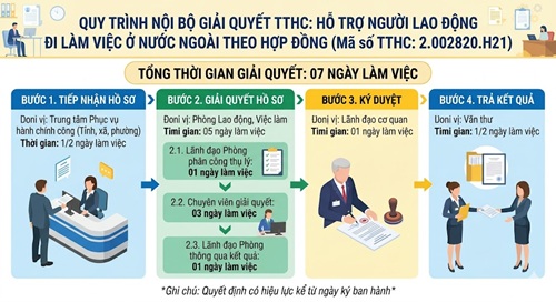 Theo đó, quy trình nội bộ giải quyết TTHC được công bố là Hỗ trợ người lao động đi làm việc ở nước ngoài theo hợp đồng, mã số TTHC 2.002820.H21. Tổng thời gian giải quyết là 07 ngày làm việc: