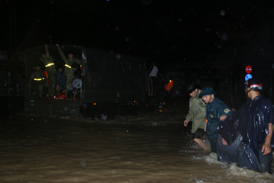 Đêm tối, lũ dâng cao, nước chảy xiết khiến công tác ứng cứu của các lực lượng gặp nhiều khó khăn. Ảnh: H.P