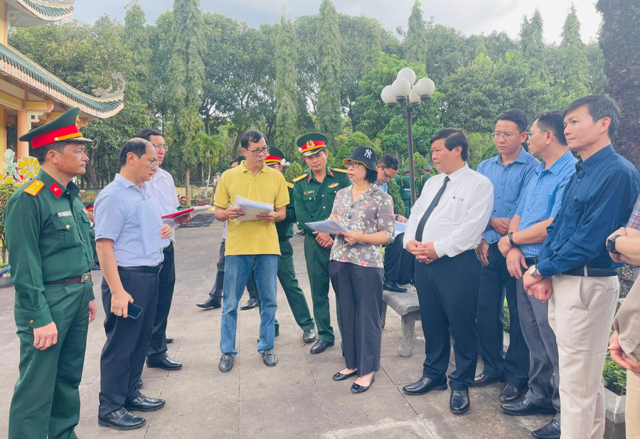 Phó Chủ tịch UBND tỉnh Nguyễn Thị Thanh Lịch (thứ 5 từ phải sang) trao đổi với các đơn vị để rút kinh nghiệm cho lễ viếng, truy điệu, an táng hài cốt liệt sĩ diễn ra chiều 11-11. Ảnh: P.D