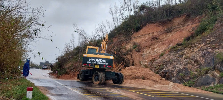 Ghi nhận tại hiện trường, nhiều vị trí ta-luy dương bị trượt đất, đất đá trên núi tràn xuống mặt đường gây cản trở phương tiện qua lại và tiềm ẩn nhiều nguy hiểm. Lực lượng thi công đã huy động xe múc, xe ben và các thiết bị chuyên dụng để xúc dọn, vận chuyển đất đá; đồng thời bố trí biển cảnh báo tại những điểm nguy hiểm.