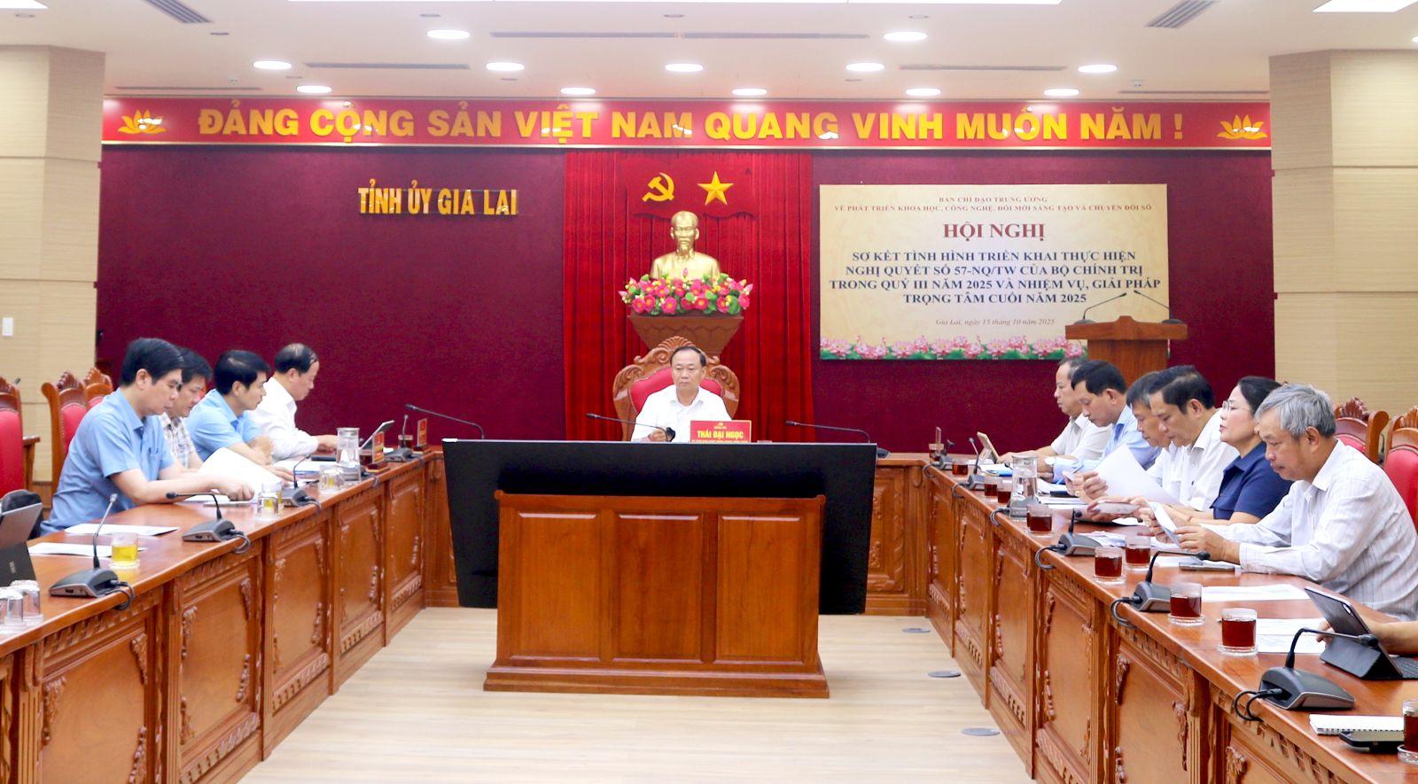 Qua thực tiễn triển khai các nhiệm vụ của Nghị quyết 57-NQ/TW tại địa phương, Bí thư Tỉnh ủy Thái Đại Ngọc đề nghị Bộ Khoa học và Công nghệ đôn đốc các bộ ngành triển khai các nền tảng số quốc gia trên quy mô toàn quốc để đẩy nhanh tiến độ chuyển đổi số; quan tâm hỗ trợ tỉnh trong lĩnh vực nghiên cứu cơ bản và hỗ trợ nâng cấp Viện Nghiên cứu khoa học và giáo dục liên ngành (IFIRSE), thuộc Trung tâm Quốc tế khoa học và giáo dục liên ngành (ICISE).