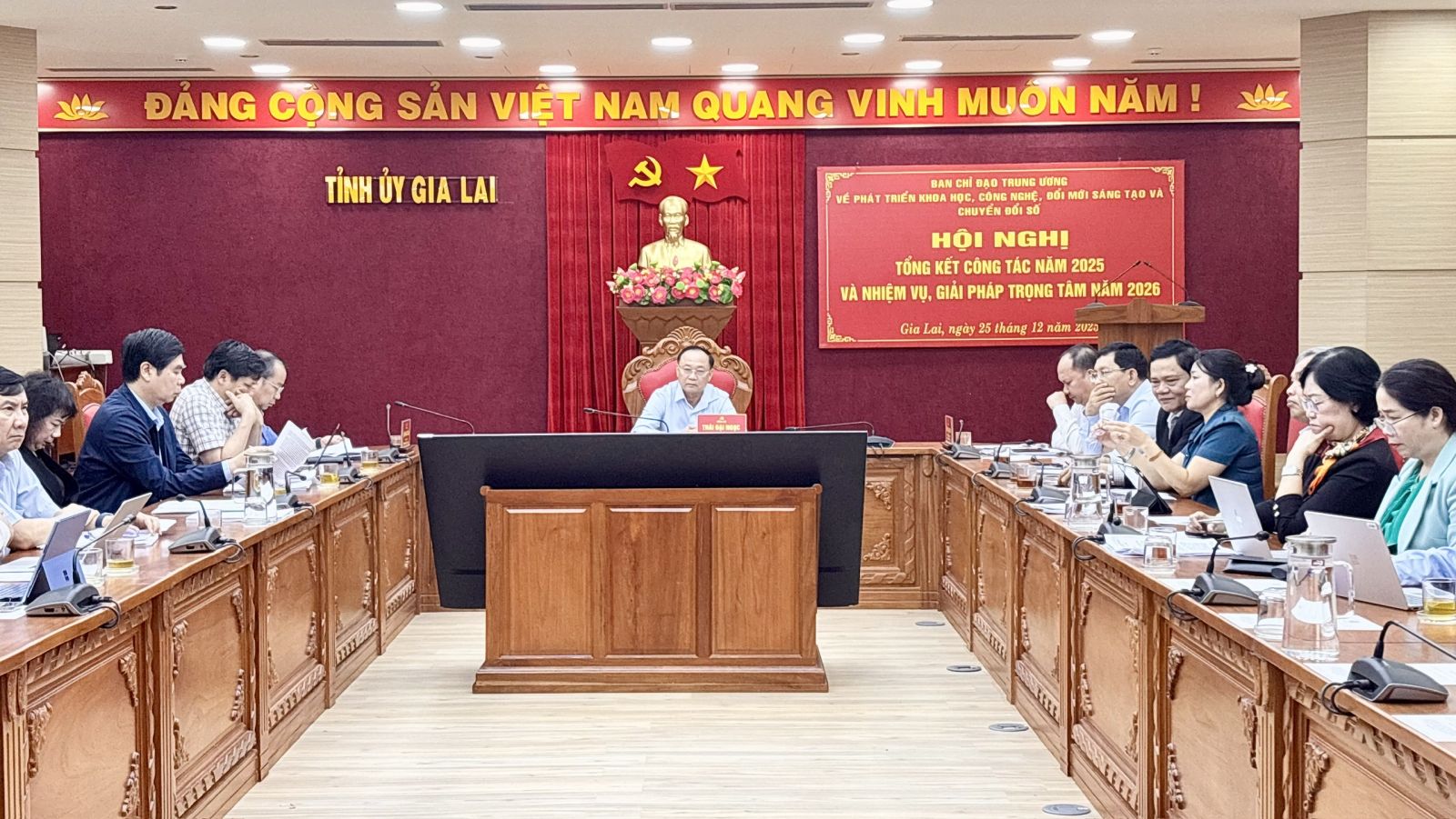Dự trực tuyến tại điểm cầu tỉnh Gia Lai có các đồng chí: Thái Đại Ngọc – Uỷ viên Ban Chấp hành Trung ương Đảng, Bí thư Tỉnh uỷ; Rah Lan Chung – Phó Bí thư Thường trực Tỉnh uỷ, Chủ tịch HĐND tỉnh; Châu Ngọc Tuấn – Phó Bí thư Tỉnh uỷ, Trưởng Đoàn đại biểu Quốc hội tỉnh; các thành viên, Tổ giúp việc Ban Chỉ đạo về phát triển khoa học, công nghệ, đổi mới sáng tạo và chuyển đổi số tỉnh.