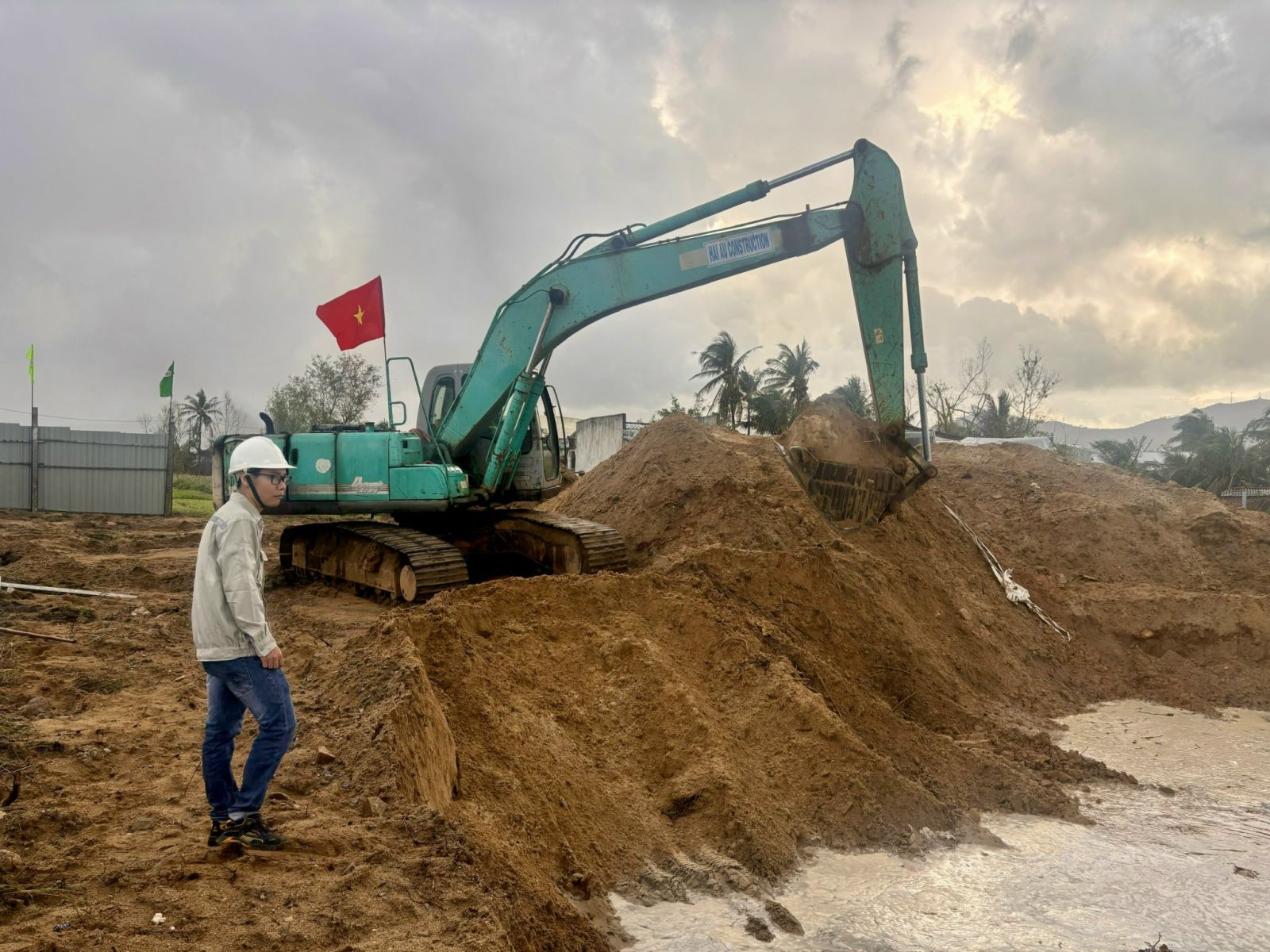 Đơn vị thi công đã tập kết vật liệu và đang triển khai xây nền móng tại dự án khu tái định cư thuộc thôn An Quang Đông, xã Đề Gi