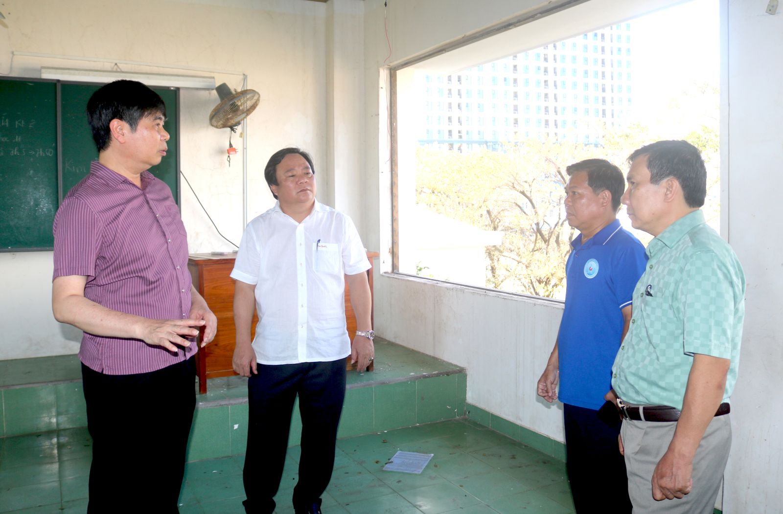 Phó Chủ tịch UBND tỉnh Lâm Hải Giang (bìa trái) đề nghị phường Quy Nhơn và Trường THPT Chuyên Lê Quý Đôn khẩn trương khắc phục hư hỏng tại các phòng học và khu ký túc xá của nhà trường.