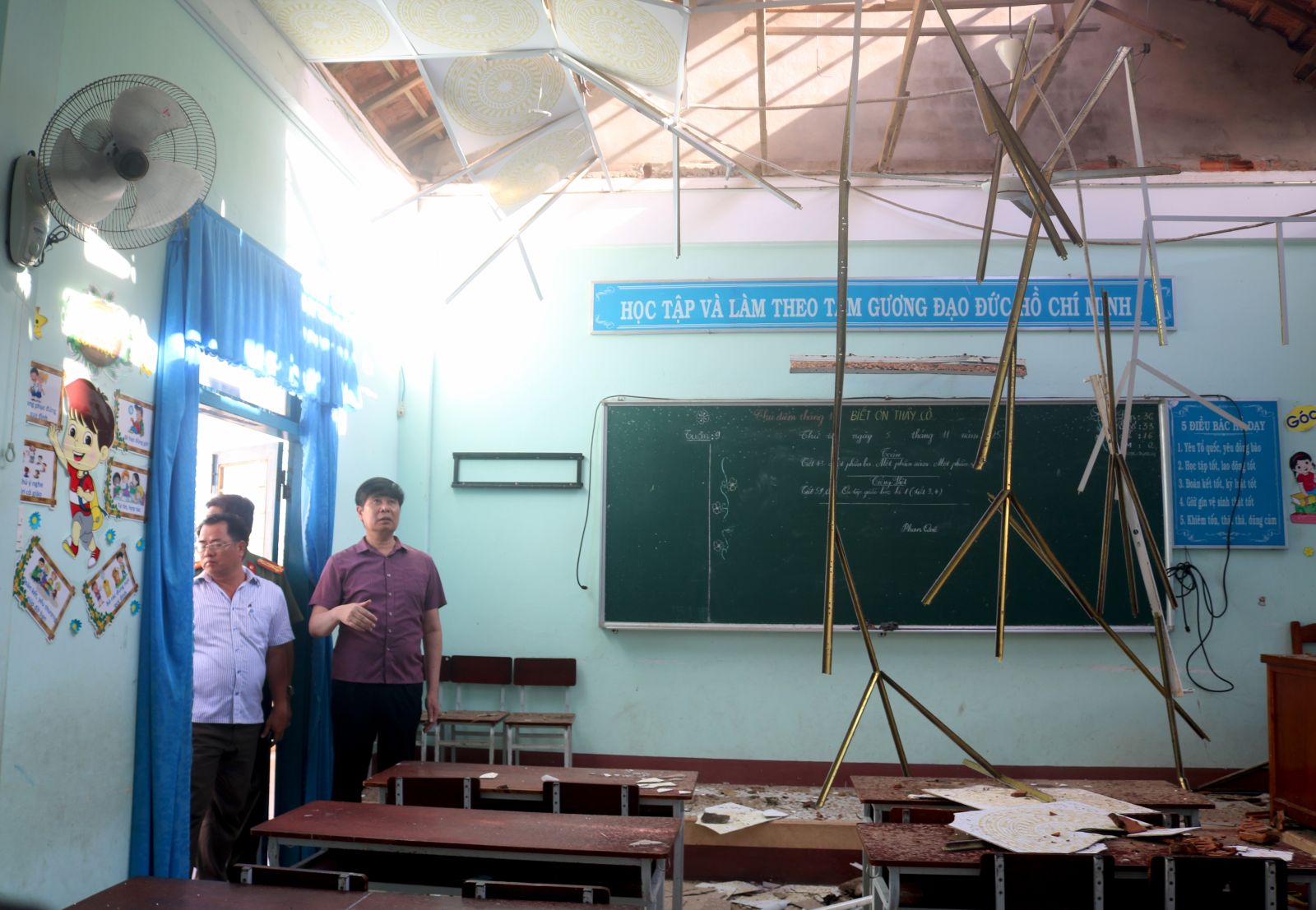 Tại các cơ sở giáo dục, Phó Chủ tịch UBND tỉnh Lâm Hải Giang đánh giá cao sự chủ động của chính quyền địa phương và các nhà trường trong công tác khắc phục hậu quả do bão số 13 gây ra. Đồng thời, đồng chí đề nghị các địa phương tạm ứng ngân sách để sửa chữa, khắc phục ngay các thiệt hại như gãy xà gồ, tốc mái, đổ cây, hư hỏng hệ thống điện…; tổ chức vệ sinh trường, lớp; bổ sung trang thiết bị giảng dạy, đồ dùng học tập, sách giáo khoa, bảo đảm các điều kiện cần thiết để học sinh sớm trở lại trường học.