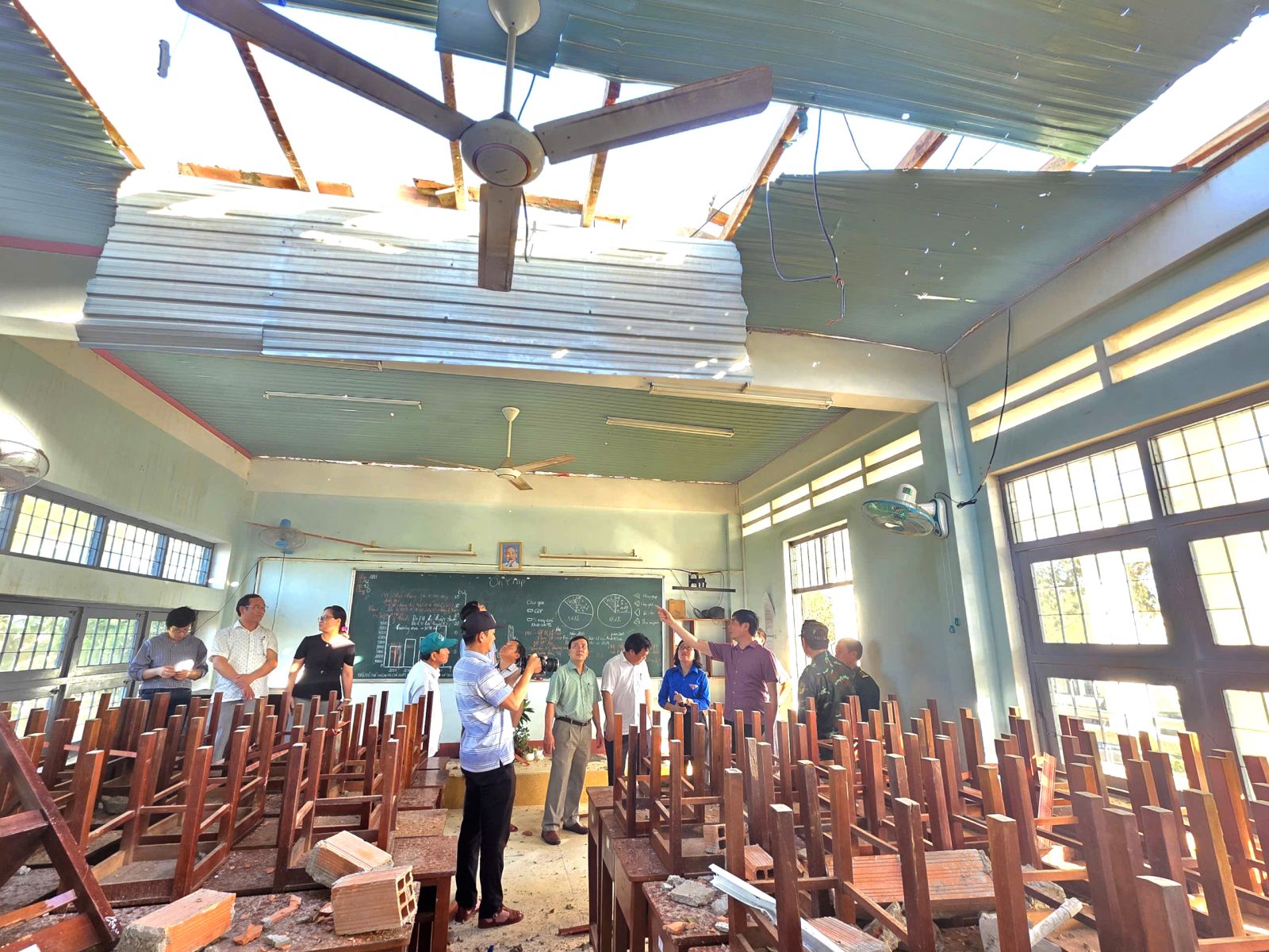 Đoàn công tác kiểm tra tình hình thiệt hại do bão số 13 tại Trường THPT Nguyễn Diêu.