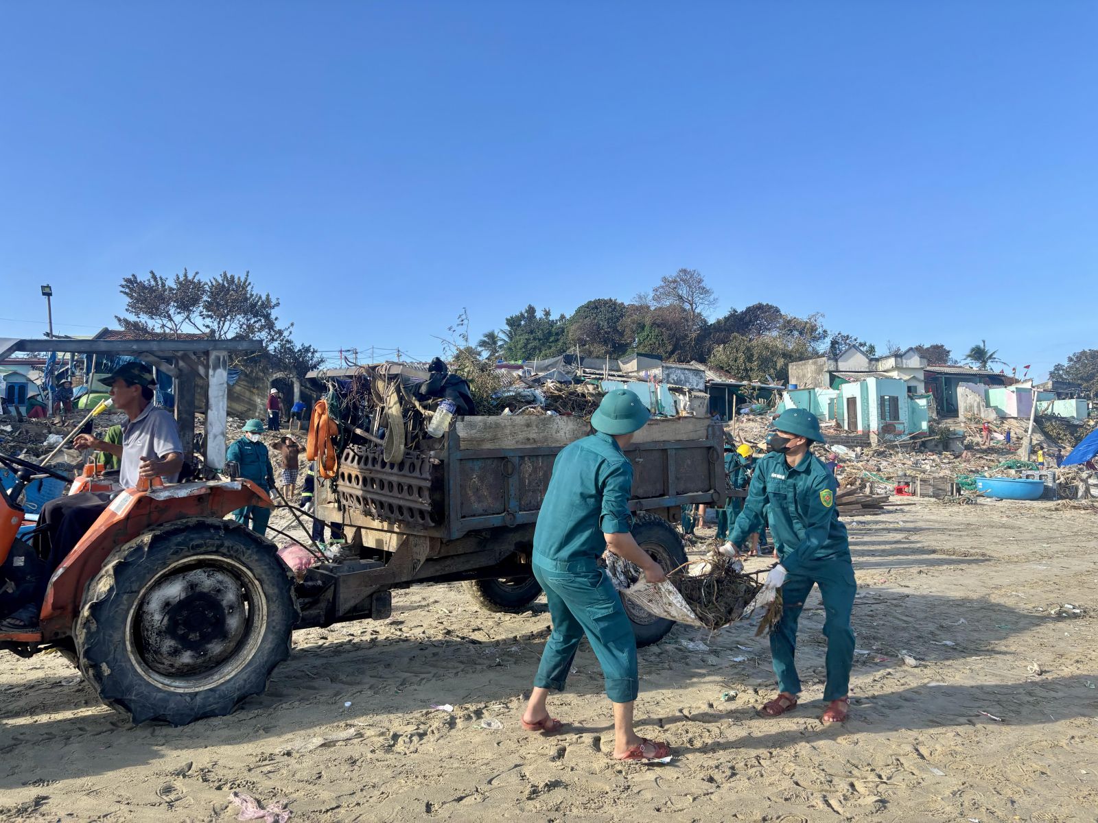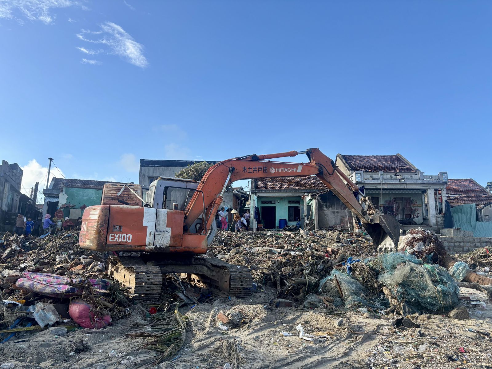 Lực lượng chức năng tích cực hỗ trợ người dân thôn Xuân Thạnh và Xuân Thạnh Nam khắc phục hậu quả sau bão
