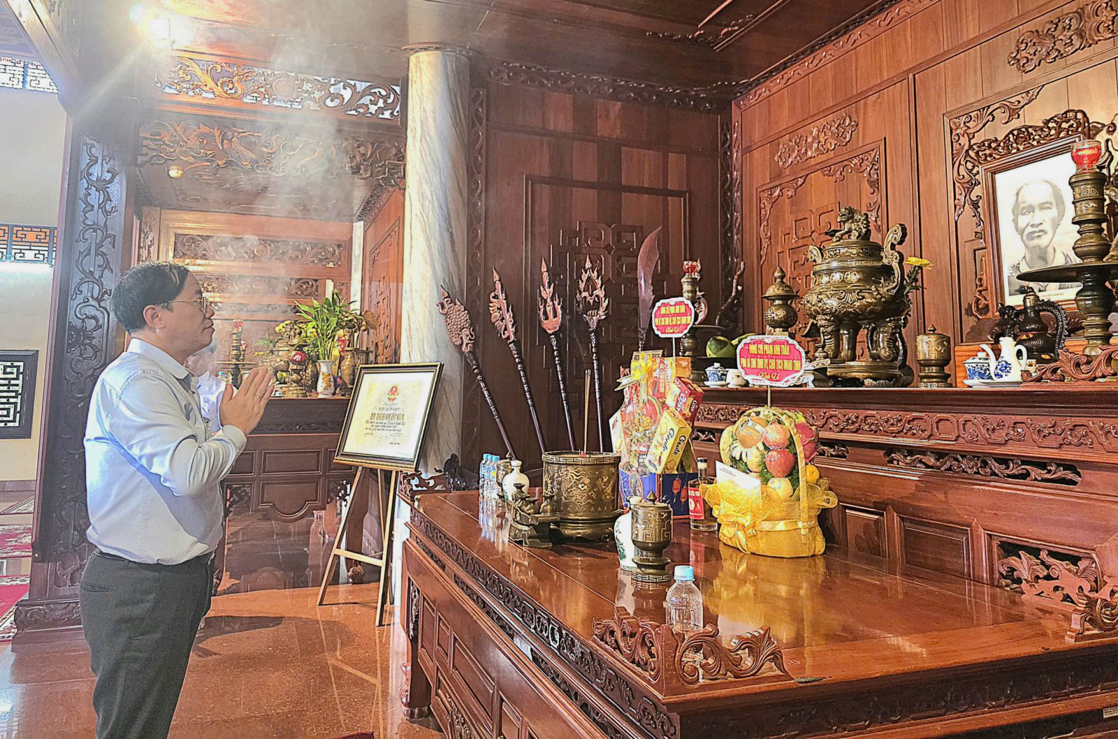 Chủ tịch UBND tỉnh Phạm Anh Tuấn dâng hương tại Khu tưởng niệm cụ Nguyễn Sinh Sắc tại di tích Huyện đường Bình Khê (xã Bình Khê).