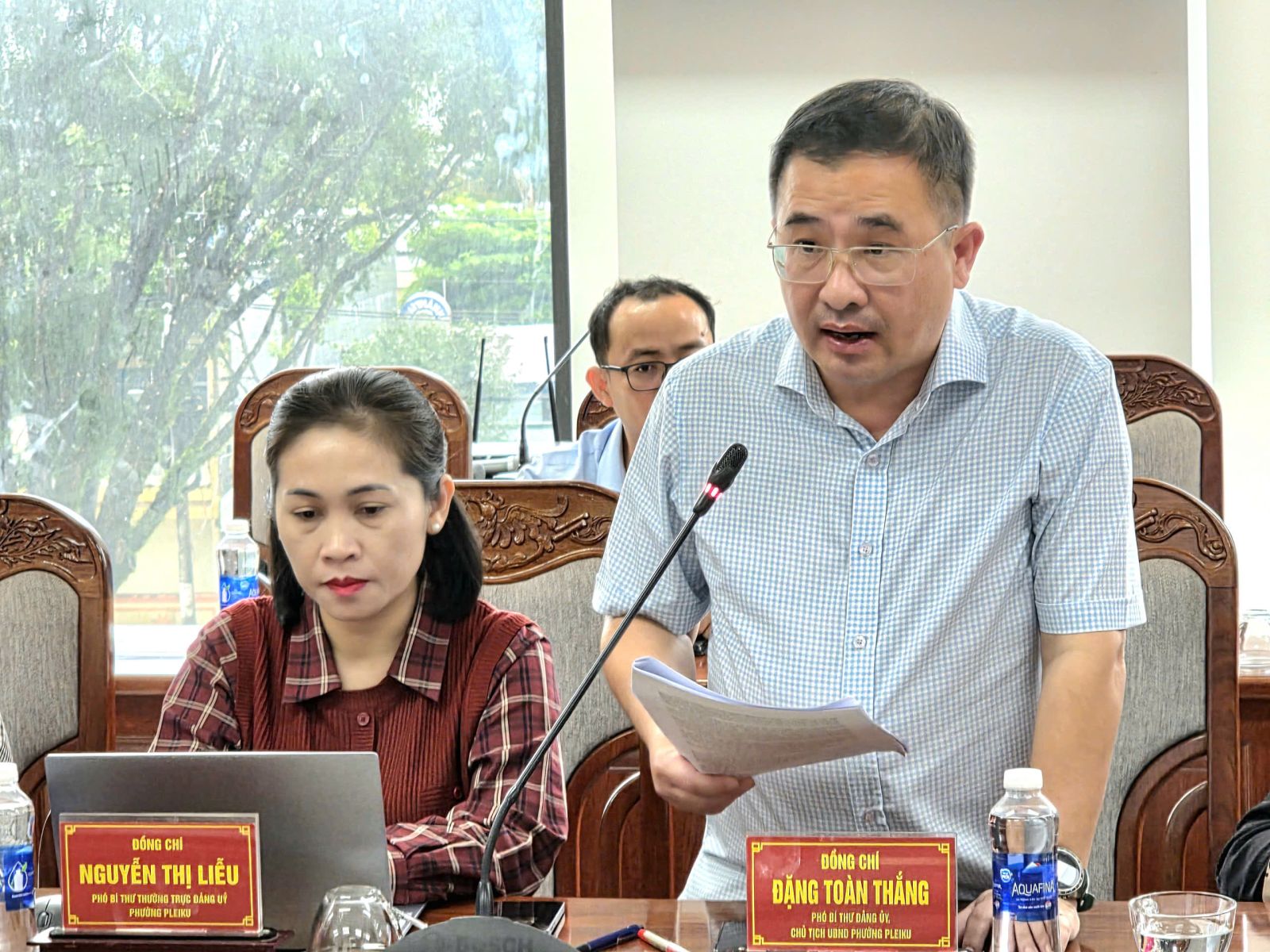 Chủ tịch UBND phường Pleiku Đặng Toàn Thắng báo cáo kết quả thực hiện các chỉ tiêu phát triển kinh tế - xã hội được giao.
