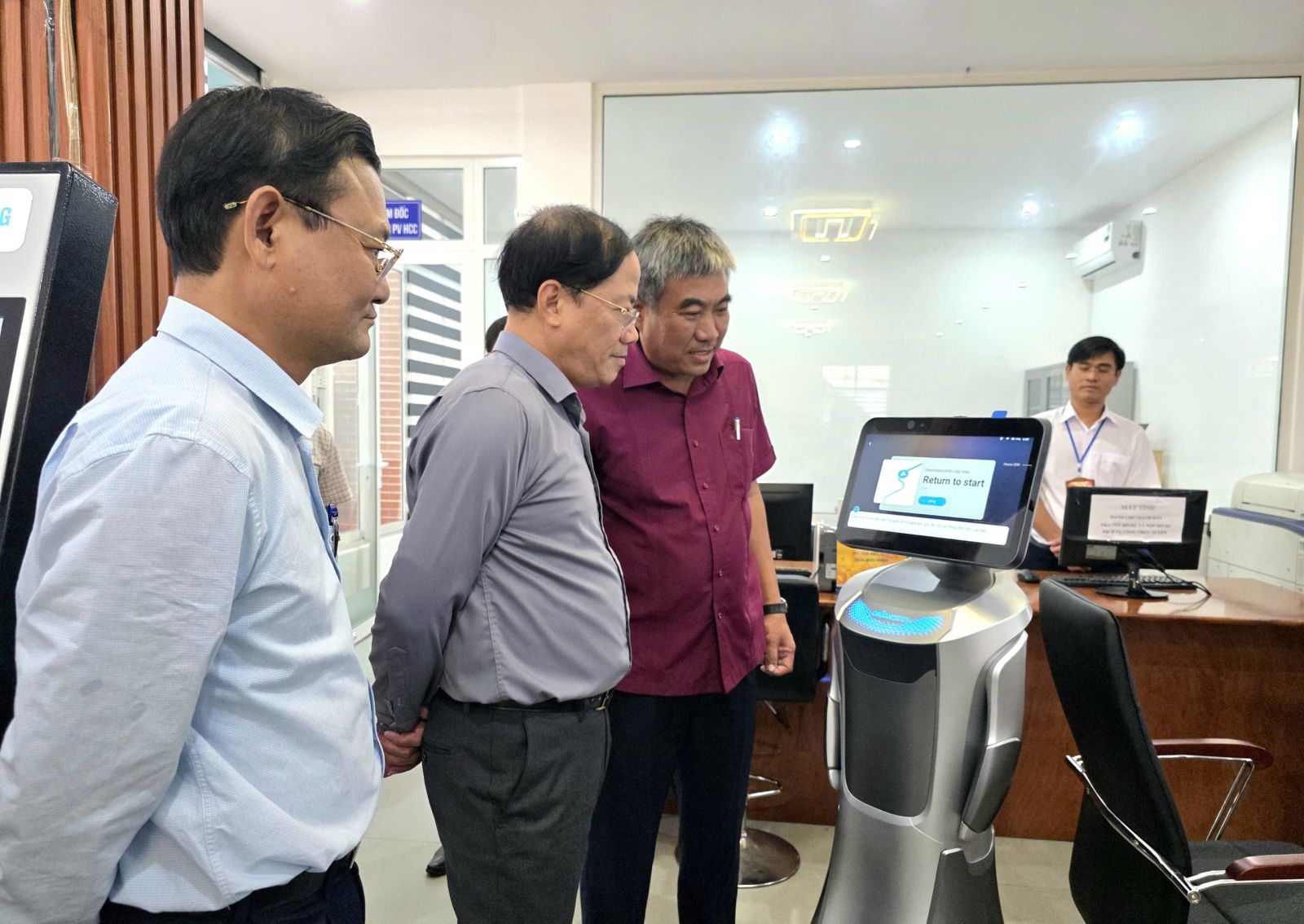 Chủ tịch UBND tỉnh Phạm Anh Tuấn và Phó Chủ tịch UBND tỉnh Nguyễn Tự Công Hoàng (bìa trái) kiểm tra Trung tâm Phục vụ hành chính công phường Hội Phú.