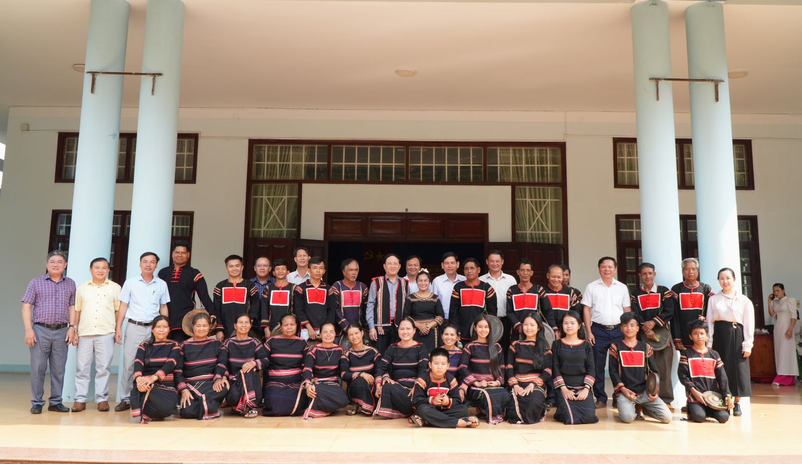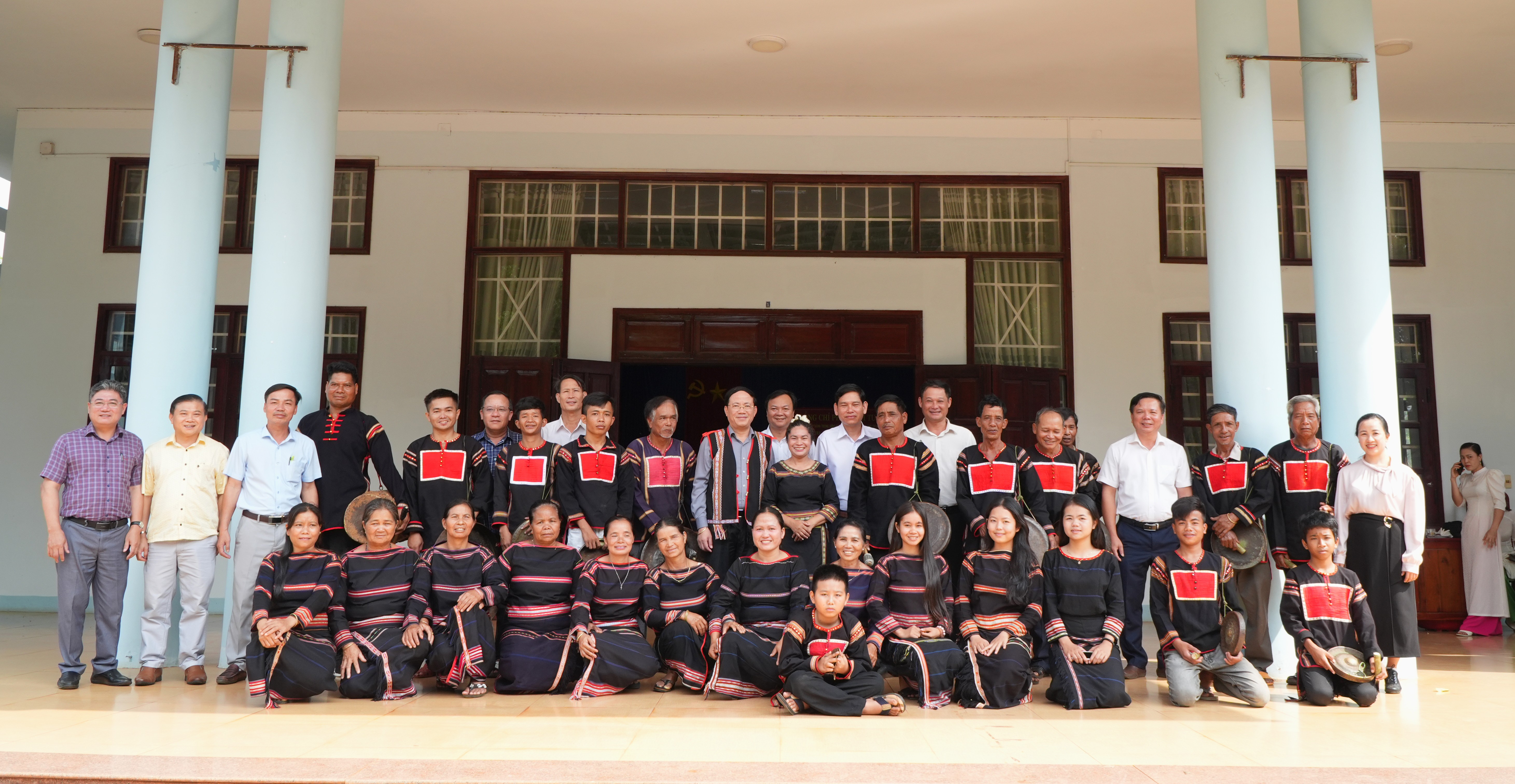 Chủ tịch UBND tỉnh Phạm Anh Tuấn và lãnh đạo các địa phương chụp ảnh cùng Đội cồng chiêng của làng Djriết, xã Chư Pưh.