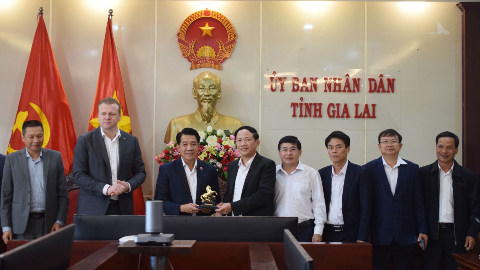 Chủ tịch UBND tỉnh Phạm Anh Tuấn tặng quà lưu niệm cho lãnh đạo Tập đoàn Hùng Nhơn và Tập đoàn De Heus