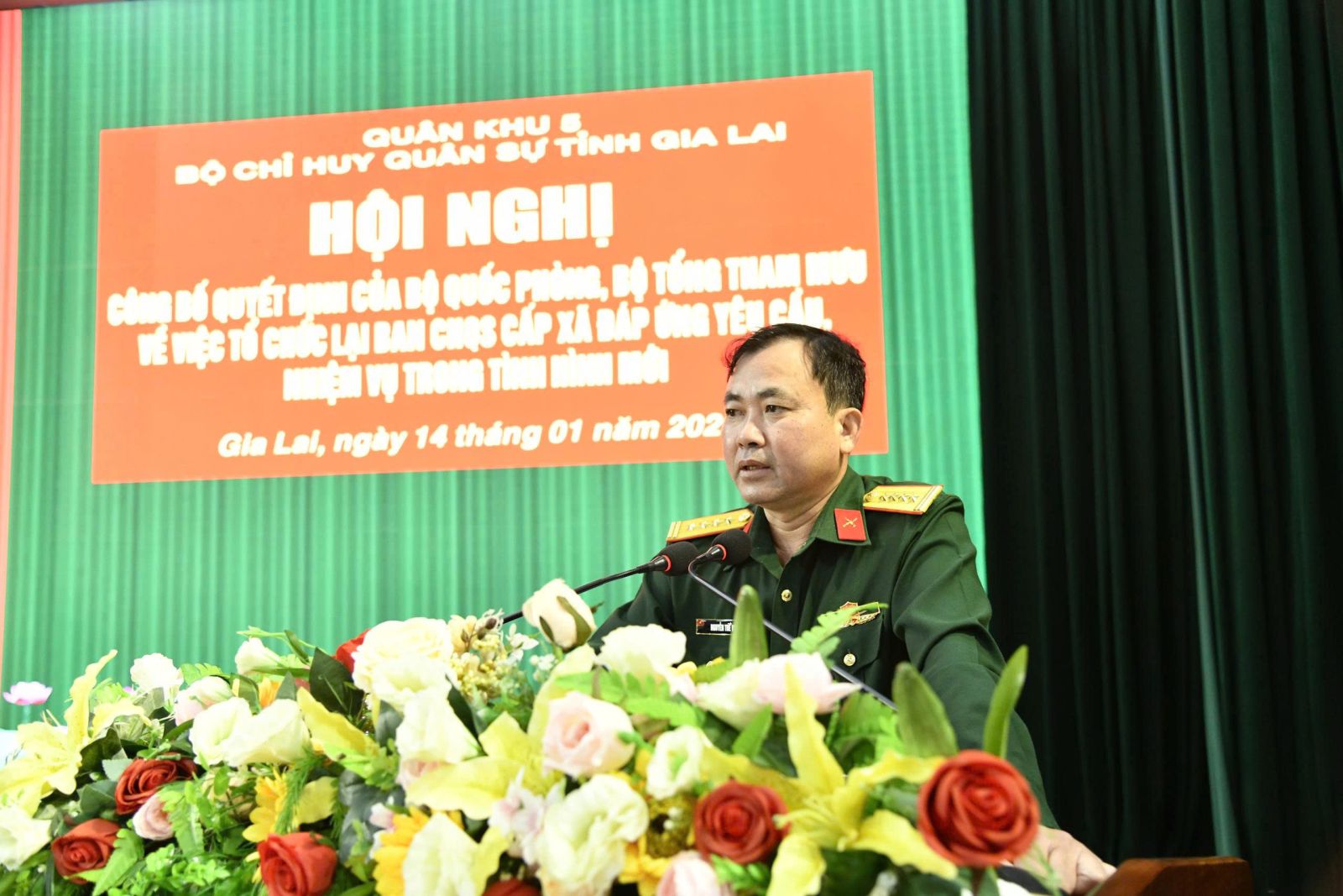 Tại hội nghị, Bộ CHQS tỉnh đã công bố quyết định của Bộ trưởng Bộ Quốc phòng về việc tổ chức lại Ban CHQS xã, phường, đặc khu trực thuộc Bộ CHQS tỉnh, thành phố; quyết định của Tổng Tham mưu trưởng Quân đội nhân dân Việt Nam ban hành biểu tổ chức, biên chế Ban CHQS cấp xã; quyết định của Bộ Tư lệnh Quân khu 5 về việc bổ nhiệm có thời hạn cán bộ giữ chức Chỉ huy trưởng Ban CHQS xã, phường; cùng các quyết định của Ban Thường vụ Tỉnh ủy về kiện toàn Ban Chấp hành, Ban Thường vụ Đảng ủy cấp xã nhiệm kỳ 2025–2030 đối với các đồng chí được điều động, bổ nhiệm.