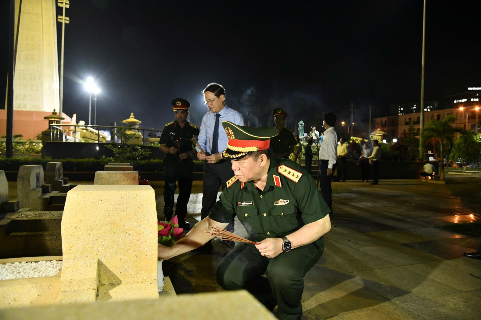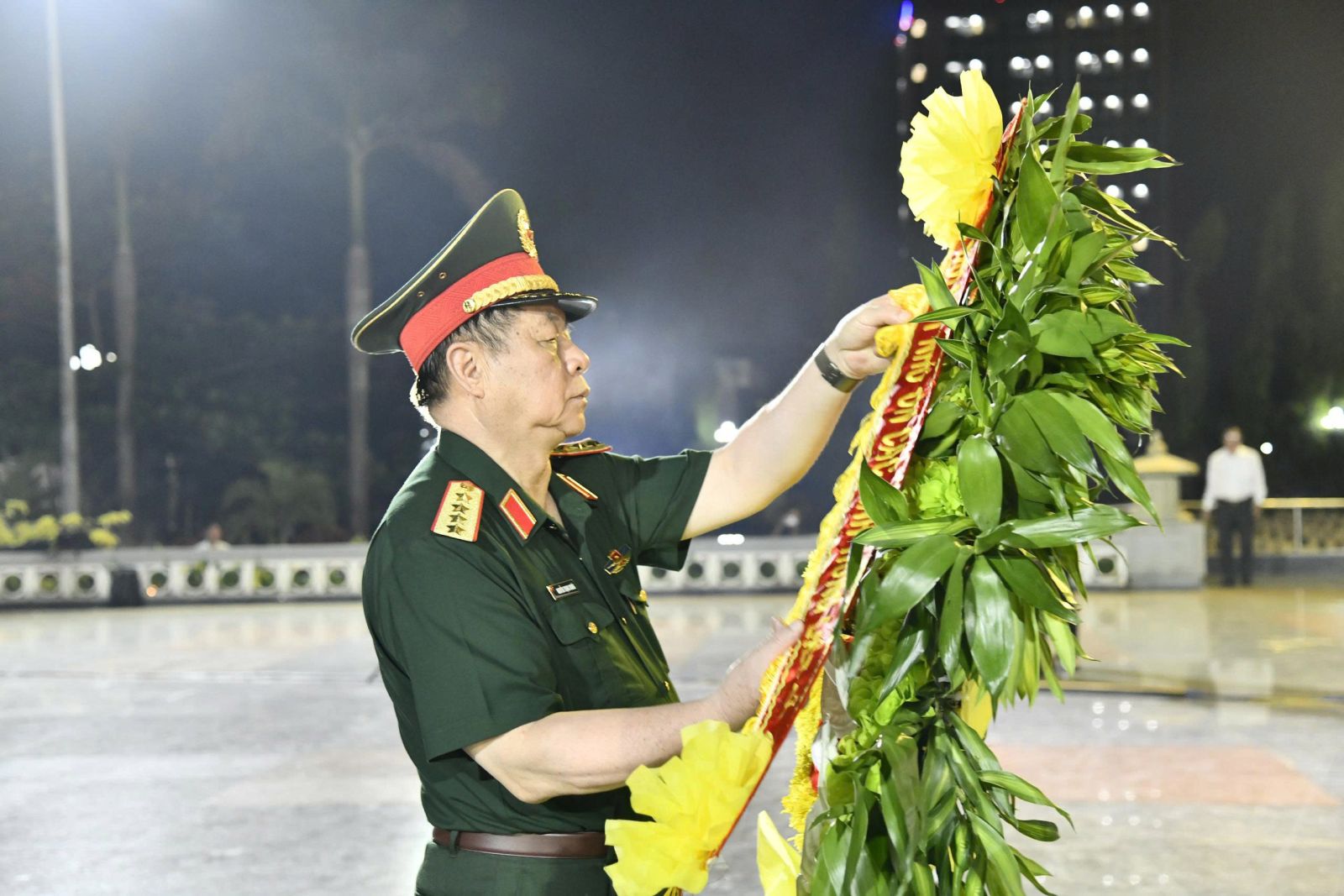 Đại tướng Nguyễn Trọng Nghĩa đặt vòng hoa mang dòng chữ “Đời đời nhớ ơn các anh hùng liệt sĩ” trước Đài tưởng niệm Nghĩa trang liệt sĩ tại phường Quy Nhơn Nam.