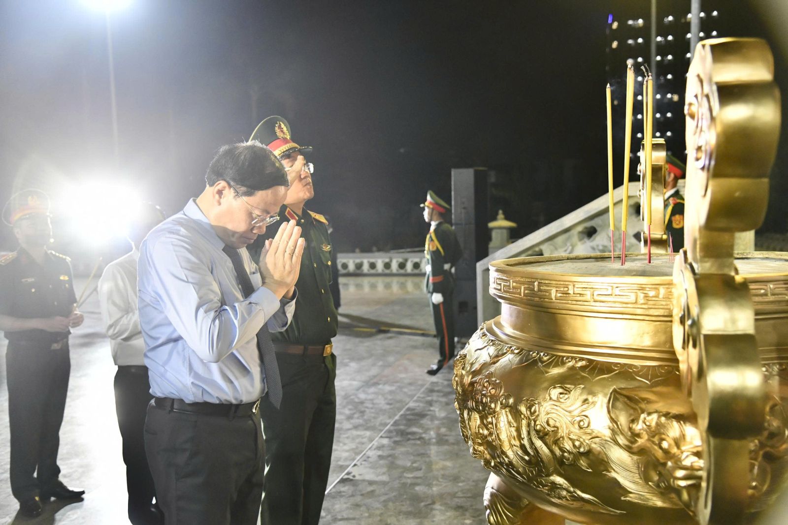 Chủ tịch UBND tỉnh Phạm Anh Tuấn (bên trái) và Thiếu tướng Lương Đình Chung (bên phải) thắp hương tưởng nhớ, tri ân các anh hùng liệt sĩ.