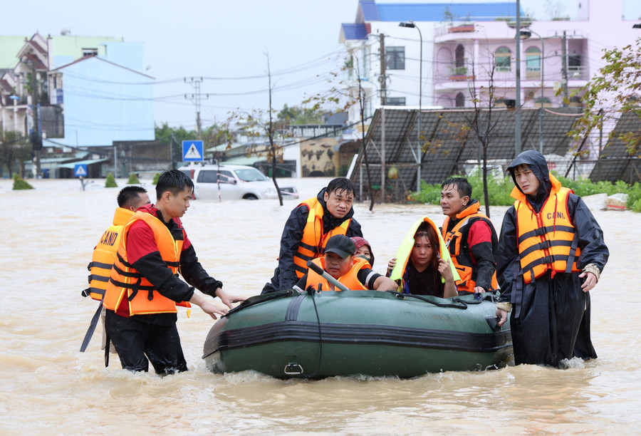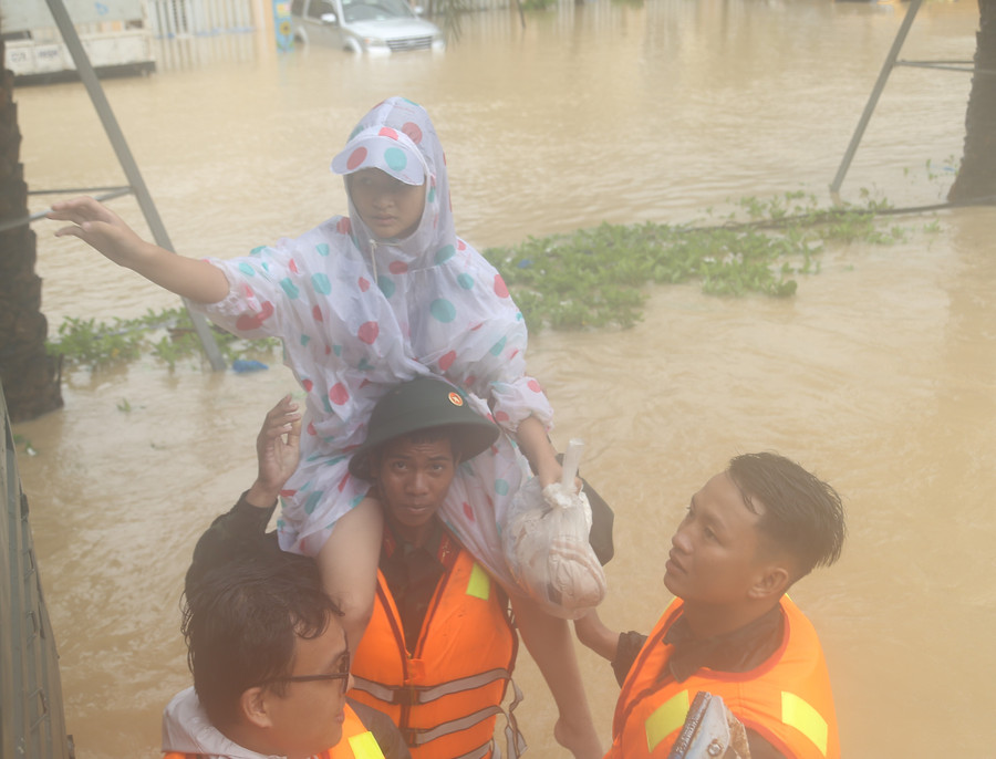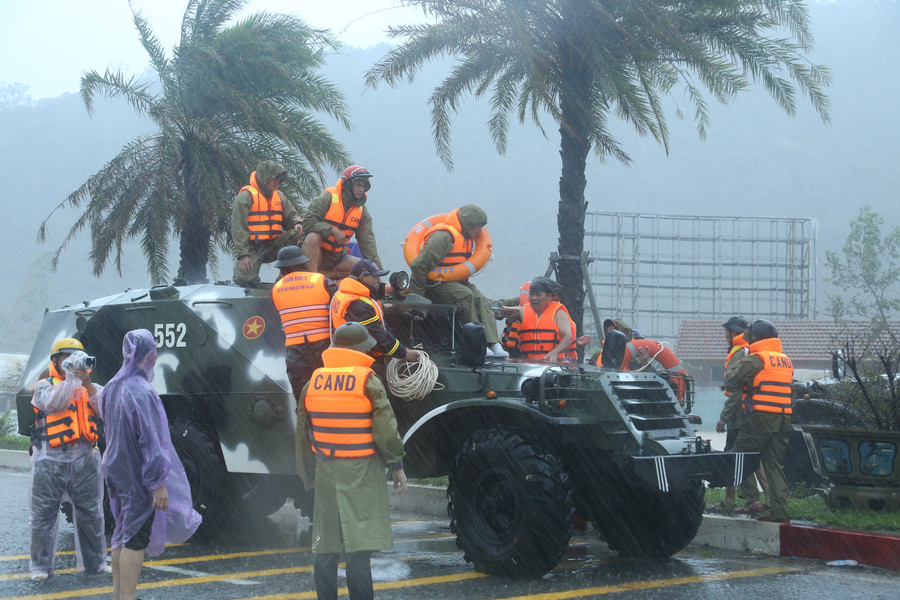 Các lực lượng không quản hiểm nguy, miệt mài gõ từng cánh cửa, cõng từng cụ già, dìu từng em nhỏ đến nơi an toàn. Ảnh: H.P