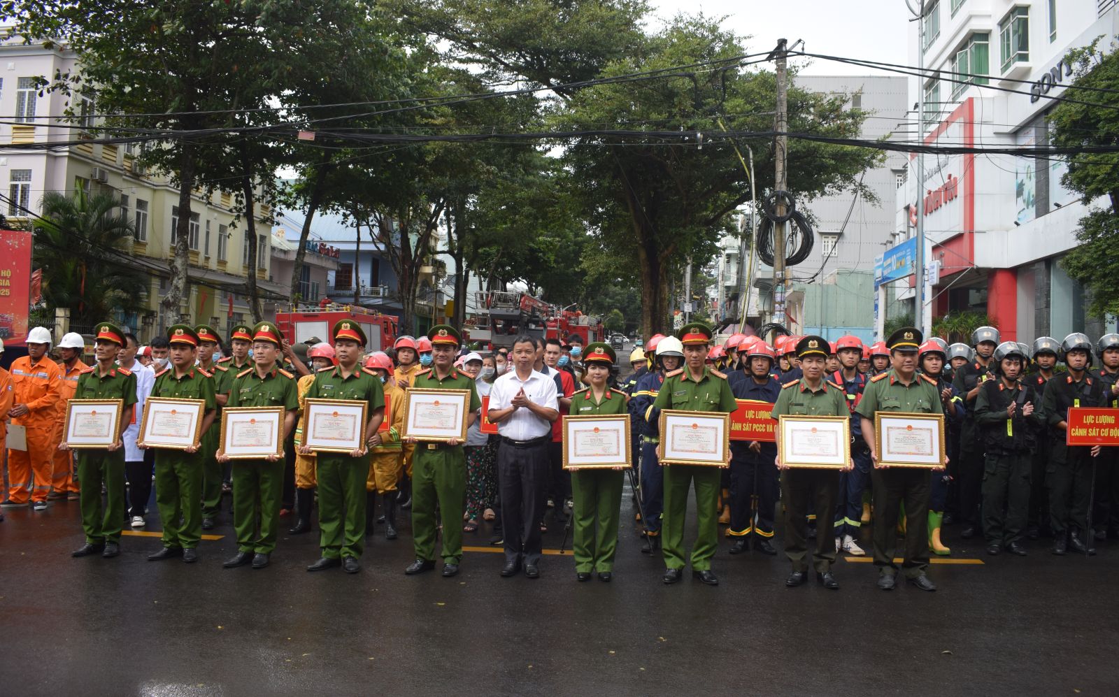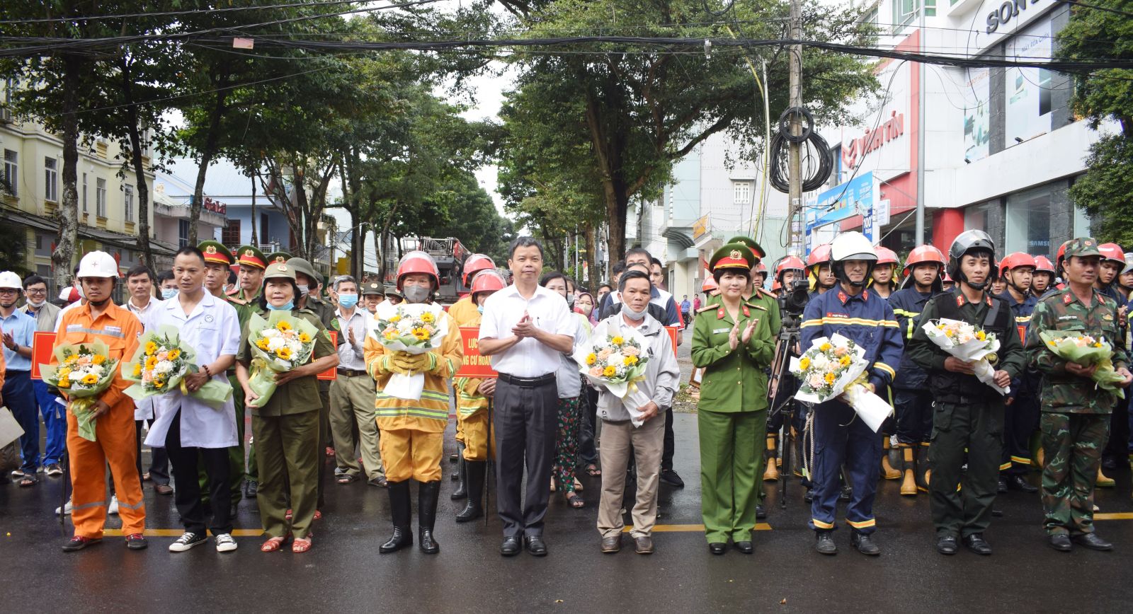 Dự buổi diễn tập có các đồng chí: Nguyễn Hữu Quế - Tỉnh ủy viên, Phó Chủ tịch UBND tỉnh, Trưởng ban Chỉ đạo PCCC và CNCH tỉnh; Thượng tá Ksor H’Bơ Khắp - Phó Giám đốc Công an tỉnh, Phó Trưởng ban Thường trực Ban Chỉ đạo PCCC và CNCH tỉnh cùng đại diện lãnh đạo các sở, ban, ngành, địa phương và đông đảo cán bộ, chiến sĩ lực lượng vũ trang tham gia.
