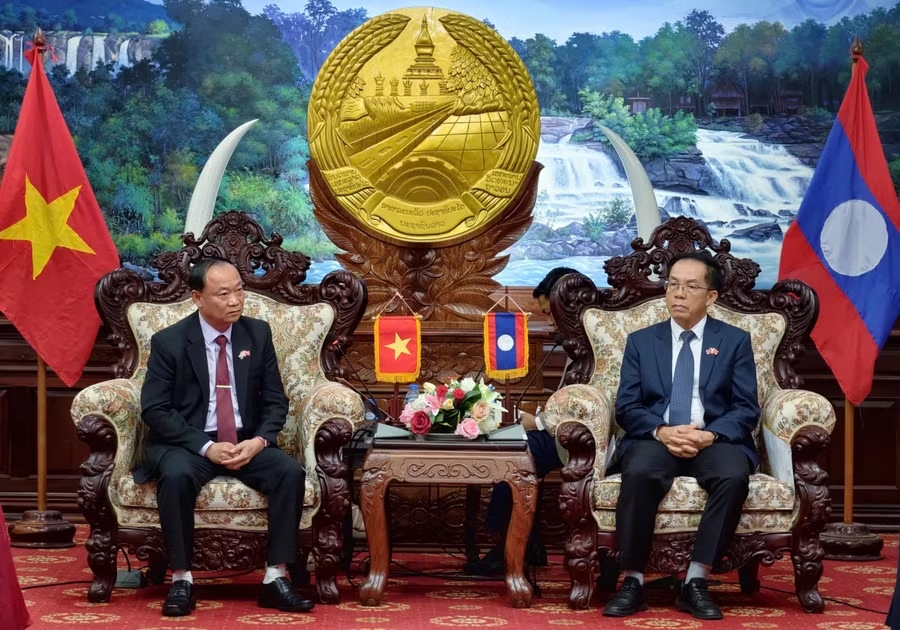 Bí thư Tỉnh ủy Thái Đại Ngọc (bên trái) trao đổi với đồng chí Đao-vông Phon-kẹo tại buổi thăm, chúc Tết tỉnh Salavan. Ảnh: Dũng Nhân