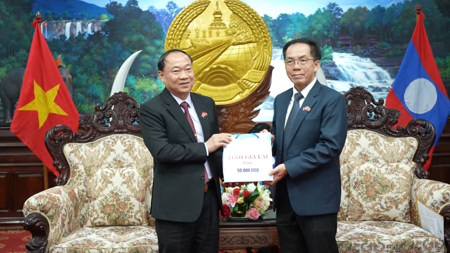 Đồng chí Thái Đại Ngọc (bên trái) trao quà lưu niệm cho tỉnh Salavan. Ảnh: Dũng Nhân