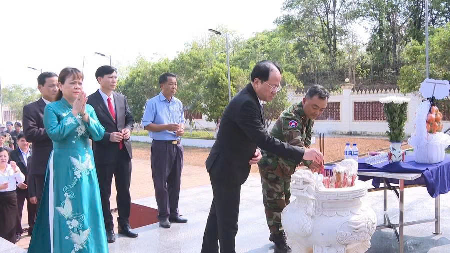 Chủ tịch UBND tỉnh Phạm Anh Tuấn (hàng đầu, bên trái) dâng hương tại Đài tưởng niệm các anh hùng liệt sĩ Campuchia - Việt Nam (giai đoạn 1979-1989) ở thành phố Stung Treng. Ảnh: R'Piên