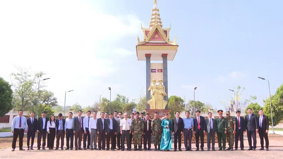 Đoàn đại biểu cấp cao tỉnh Gia Lai chụp hình lưu niệm tại Đài tưởng niệm các anh hùng liệt sĩ Campuchia - Việt Nam (giai đoạn 1979-1989) ở thành phố Stung Treng. Ảnh: R'Piên