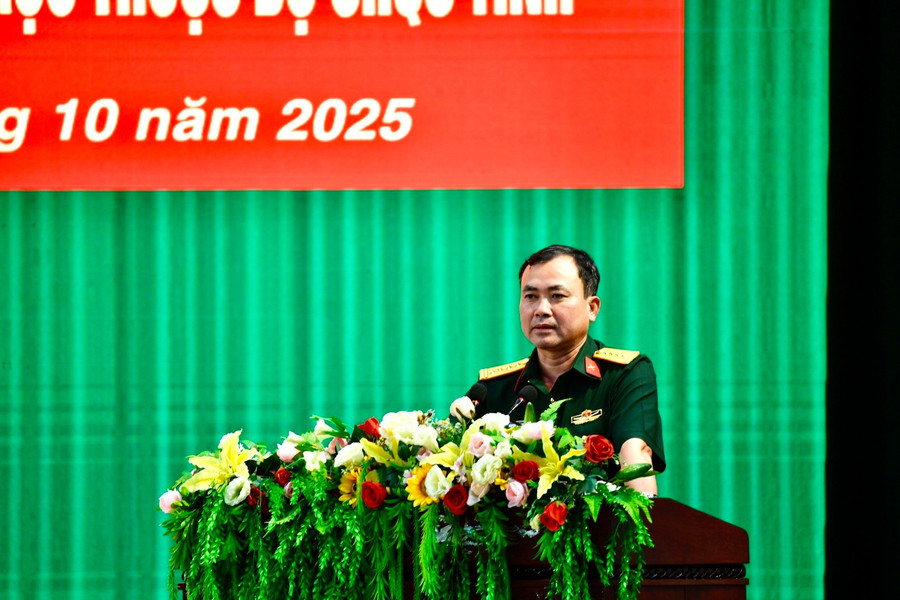 Đại tá Nguyễn Thế Vinh-Chỉ huy trưởng Bộ CHQS tỉnh phát biểu tại hội nghị. Ảnh: H.P