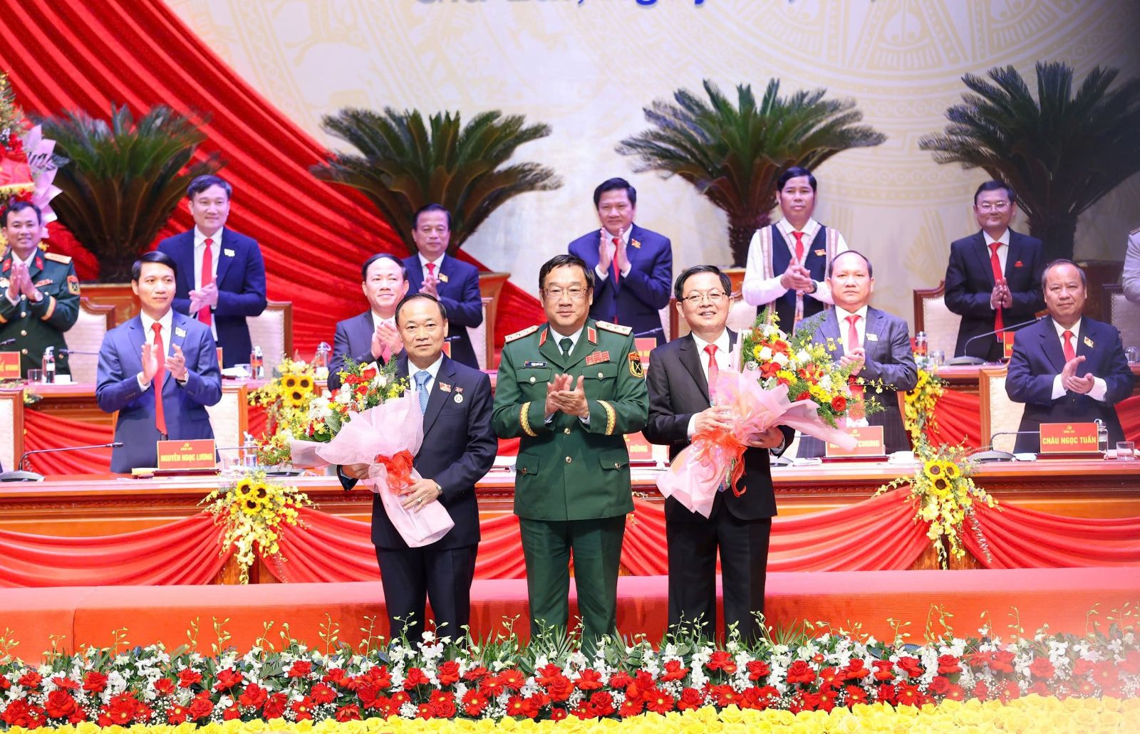 Thượng tướng Phạm Hoài Nam - Ủy viên Ban Chấp hành Trung ương Đảng, Ủy viên Quân ủy Trung ương, Thứ trưởng Bộ Quốc phòng (giữa) tặng hoa đồng chí Thái Đại Ngọc - Bí thư Tỉnh ủy Gia Lai (bên trái) và đồng chí Hồ Quốc Dũng - Nguyên Bí thư Tỉnh ủy Gia Lai (bên phải).