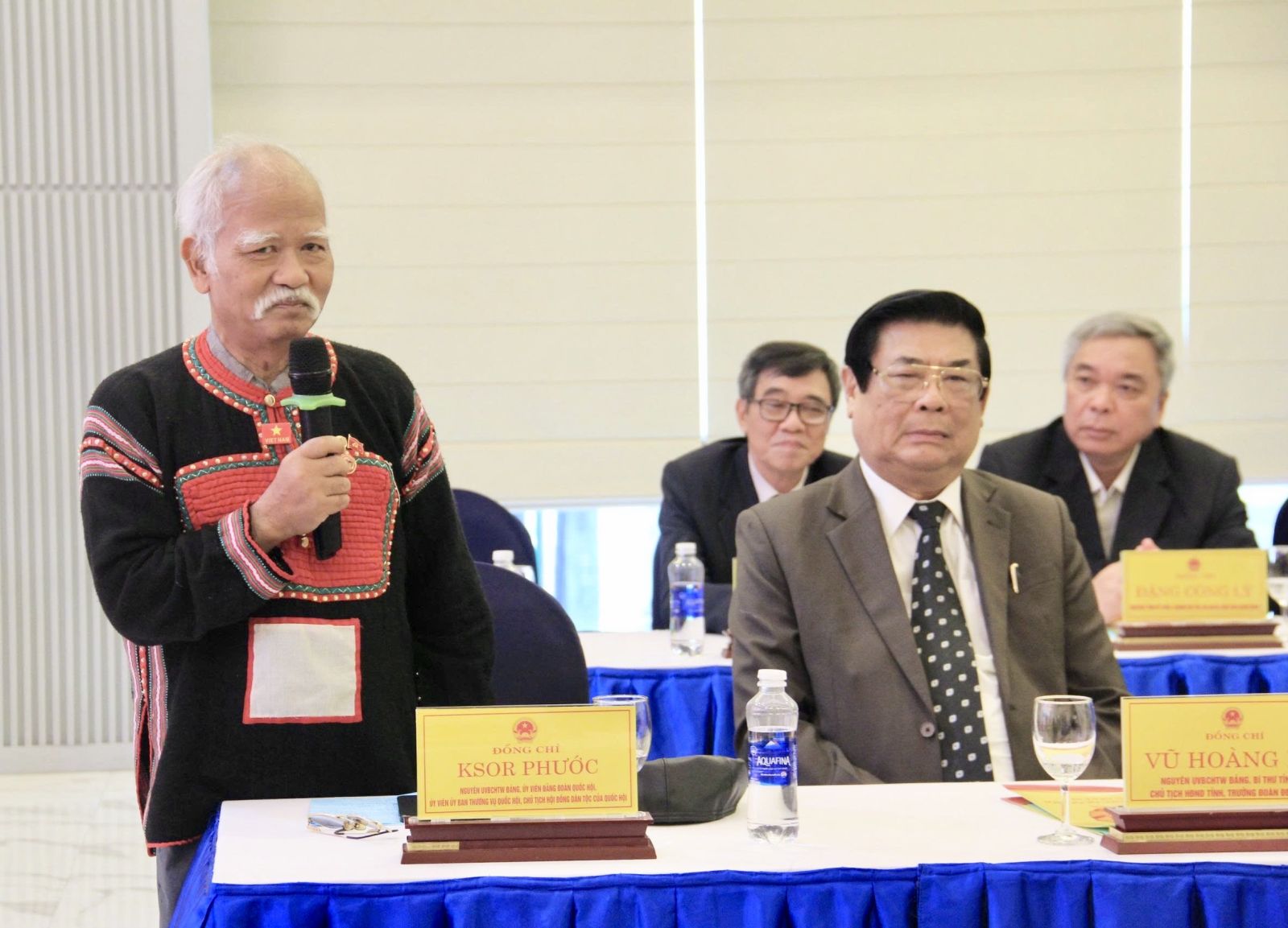 Đồng chí Ksor Phước - nguyên Ủy viên Trung ương Đảng, nguyên Bộ trưởng, Chủ nhiệm Ủy ban Dân tộc Quốc hội, ĐBQH các khóa X, XI, XII, XIII, nguyên Bí thư Tỉnh ủy Gia Lai (cũ) chia sẻ tại buổi gặp mặt