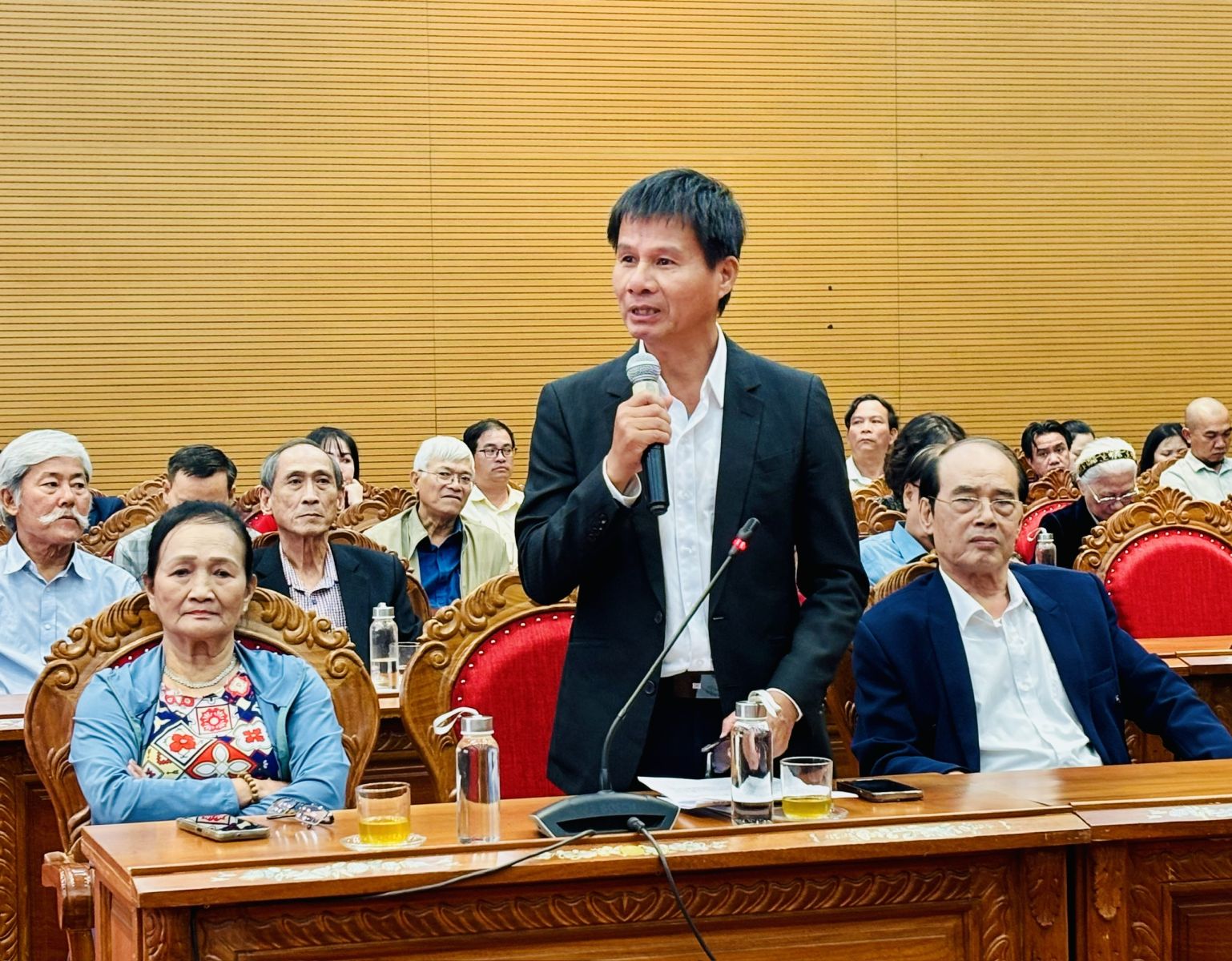 Nghệ sĩ ưu tú Đặng Công Hưng - Chủ tịch Hội Văn học Nghệ thuật tỉnh trao đổi ý kiến tại buổi gặp mặt