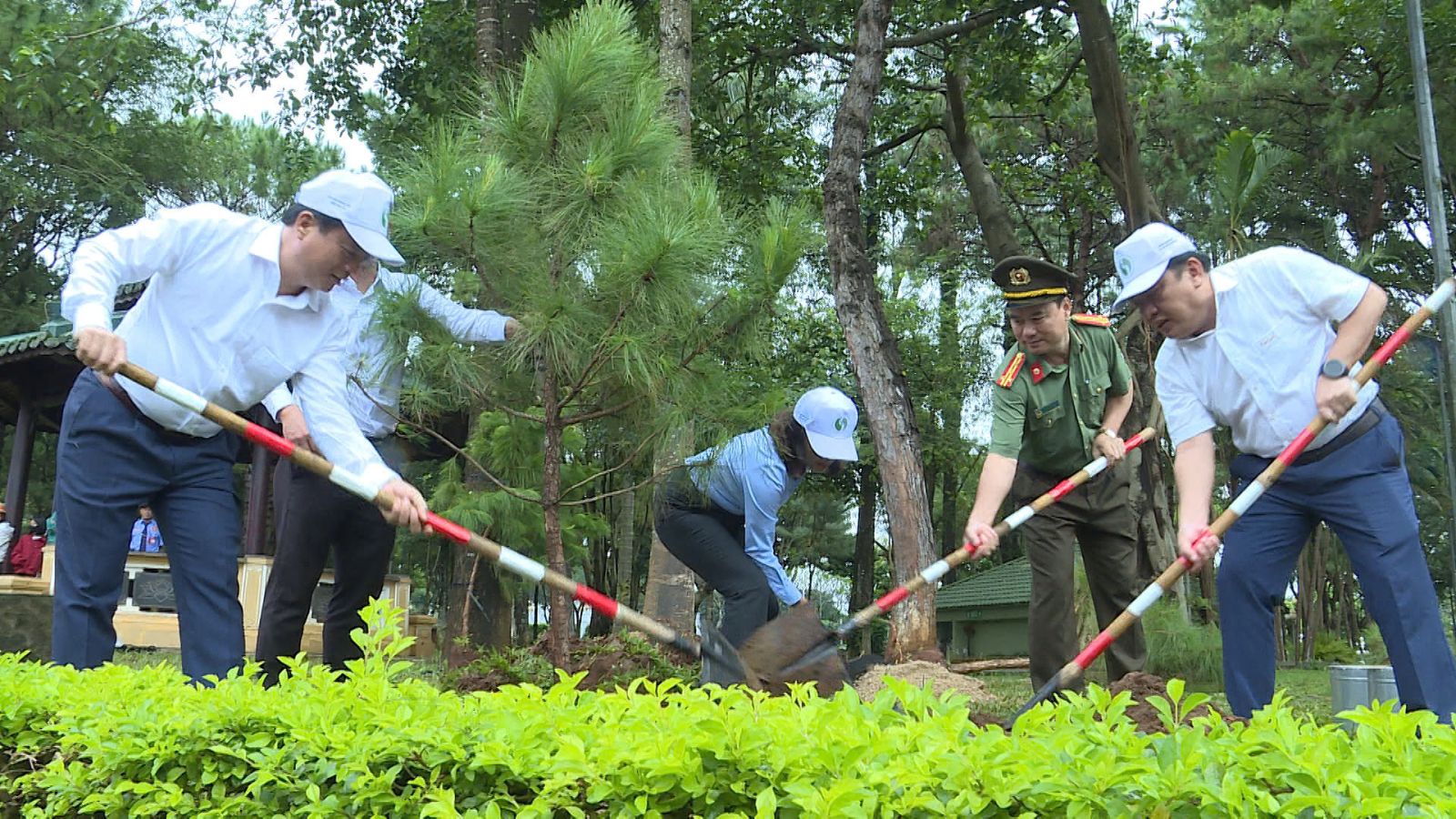 Phó Chủ tịch Thường trực UBND tỉnh Nguyễn Tuấn Thanh (ngoài cùng bên trái) cùng các đại biểu đã tham gia trồng cây xanh tại Quảng trường Đại Đoàn Kết