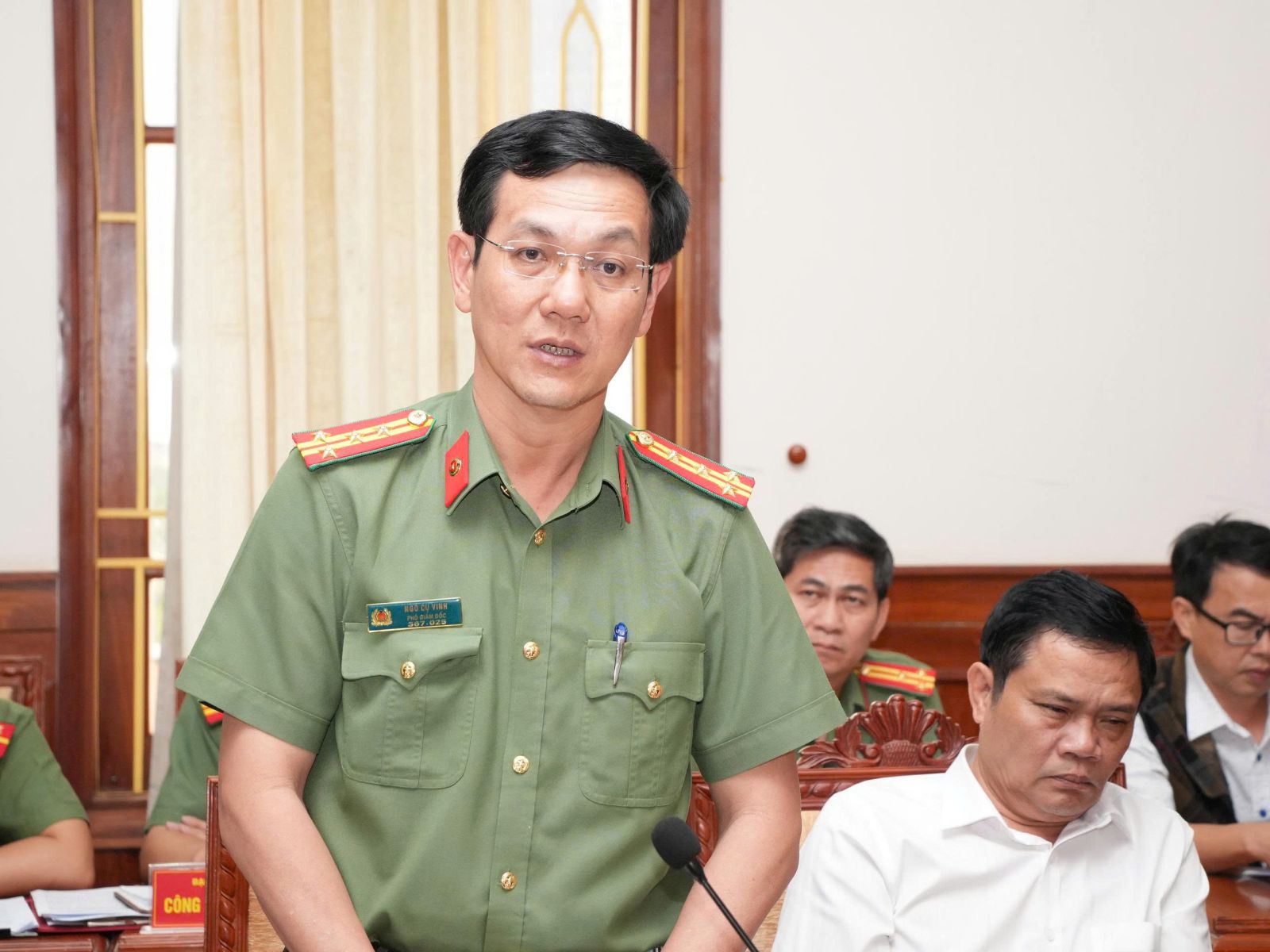 Đại tá Ngô Cự Vinh, Phó Giám đốc Công An tỉnh báo cáo tại Hội nghị