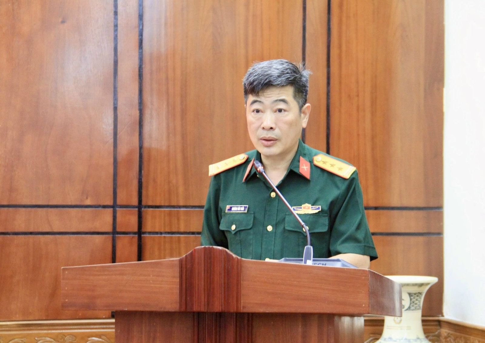 Thượng tá Khương Văn Tuấn - Phó Tham mưu trưởng Bộ Chỉ huy Quân sự tỉnh báo cáo kết quả thực hiện công tác tuyển chọn, gọi công dân nhập ngũ và thực hiện nghĩa vụ tham gia Công an nhân dân năm 2026