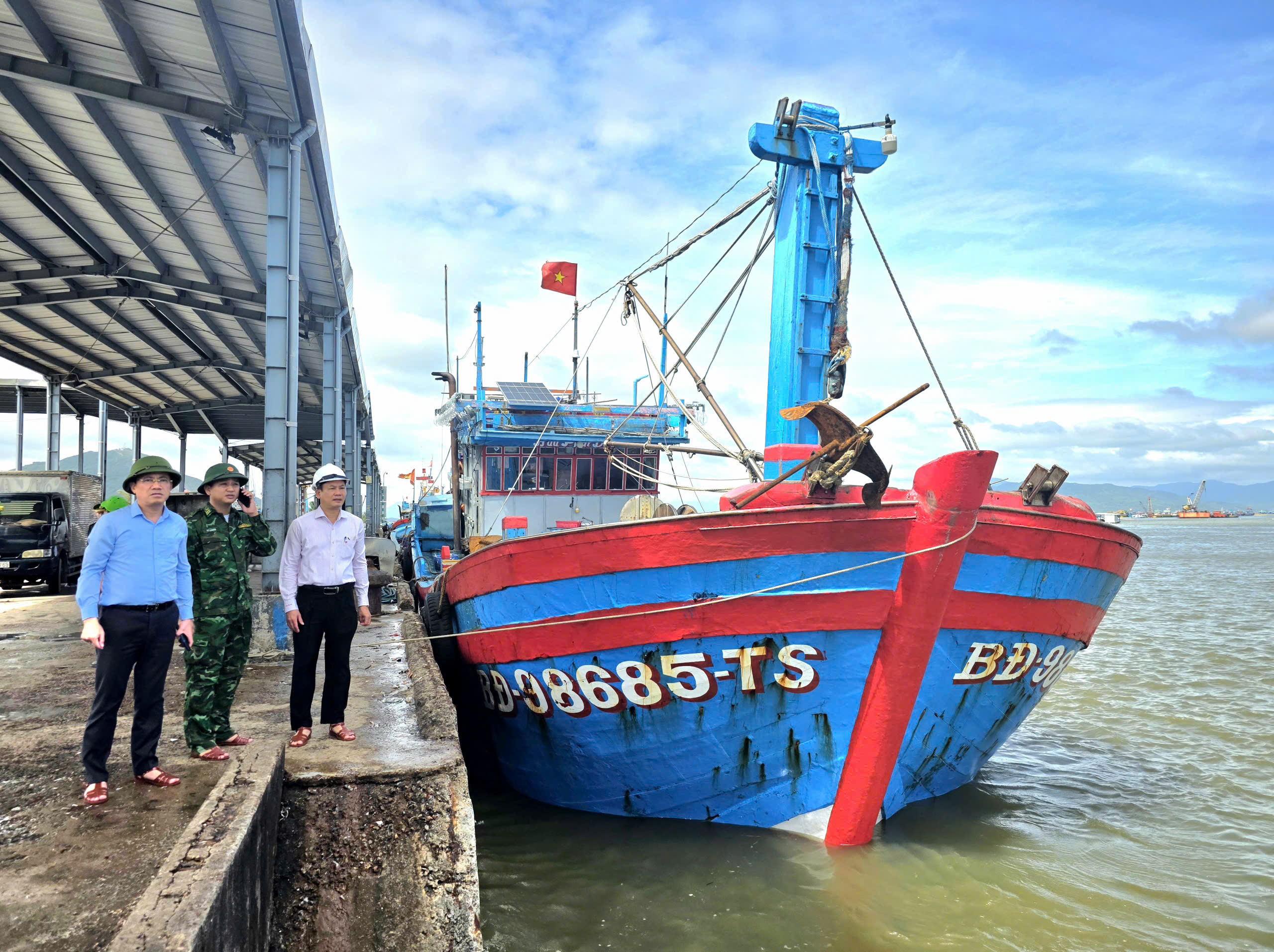 Chủ tịch UBND tỉnh Phạm Anh Tuấn (bìa trái) kiểm tra công tác ứng phó với bão số 13 tại Cảng cá Đề Gi.